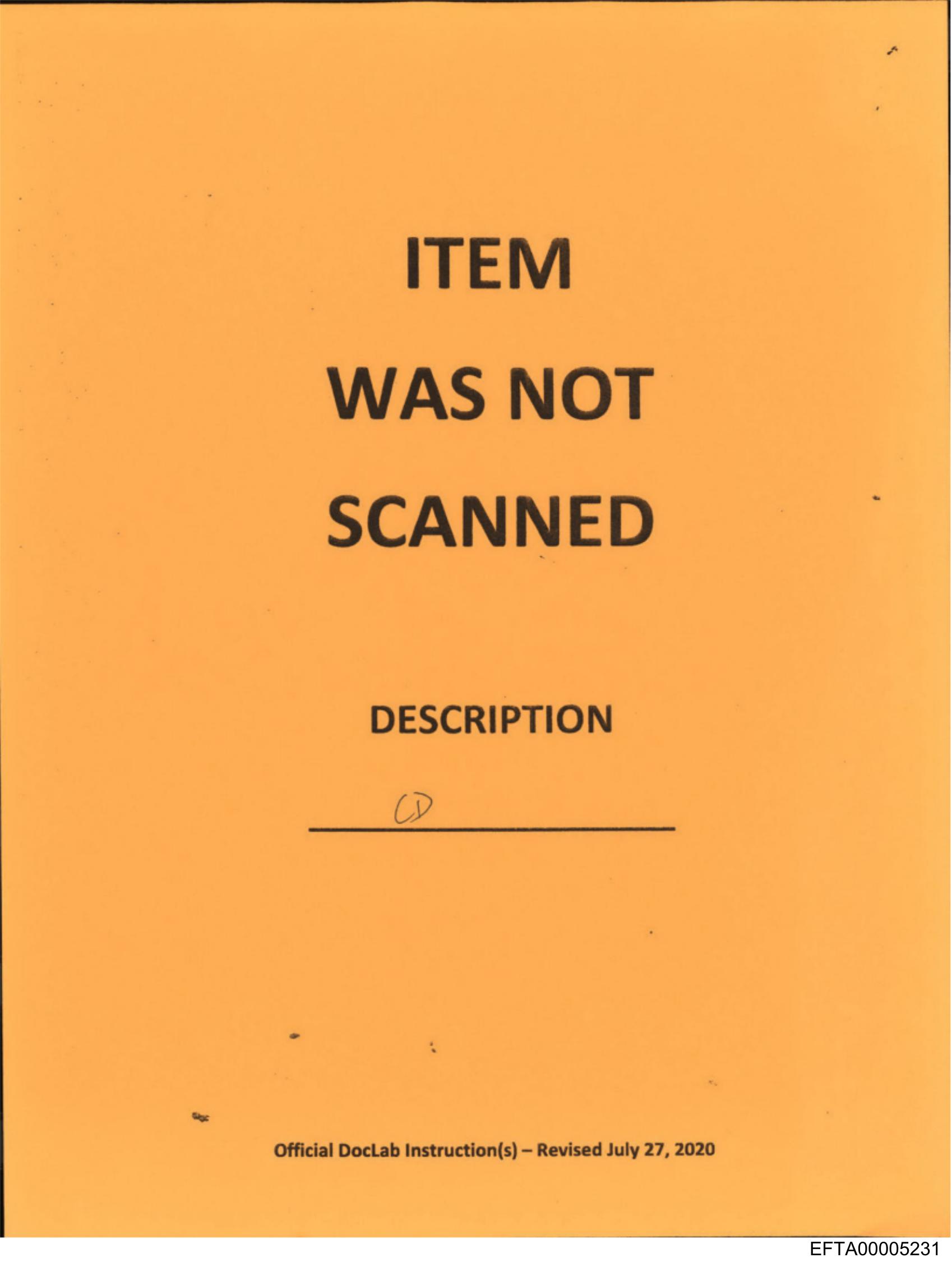 The image shows a yellow slip of paper with printed and handwritten information on it. The top part of the paper has bold print that reads "ITEM WAS NOT SCANNED" in black ink. Below this header, there is a line for description where someone has written "Desk area" in pen. In the bottom right corner of the page, there's an official stamp or mark with text that includes "Official Books," "Department of Defense," and other information that is too small to read clearly. The style of the image suggests it might be a photograph taken of a physical document rather than a digital creation.