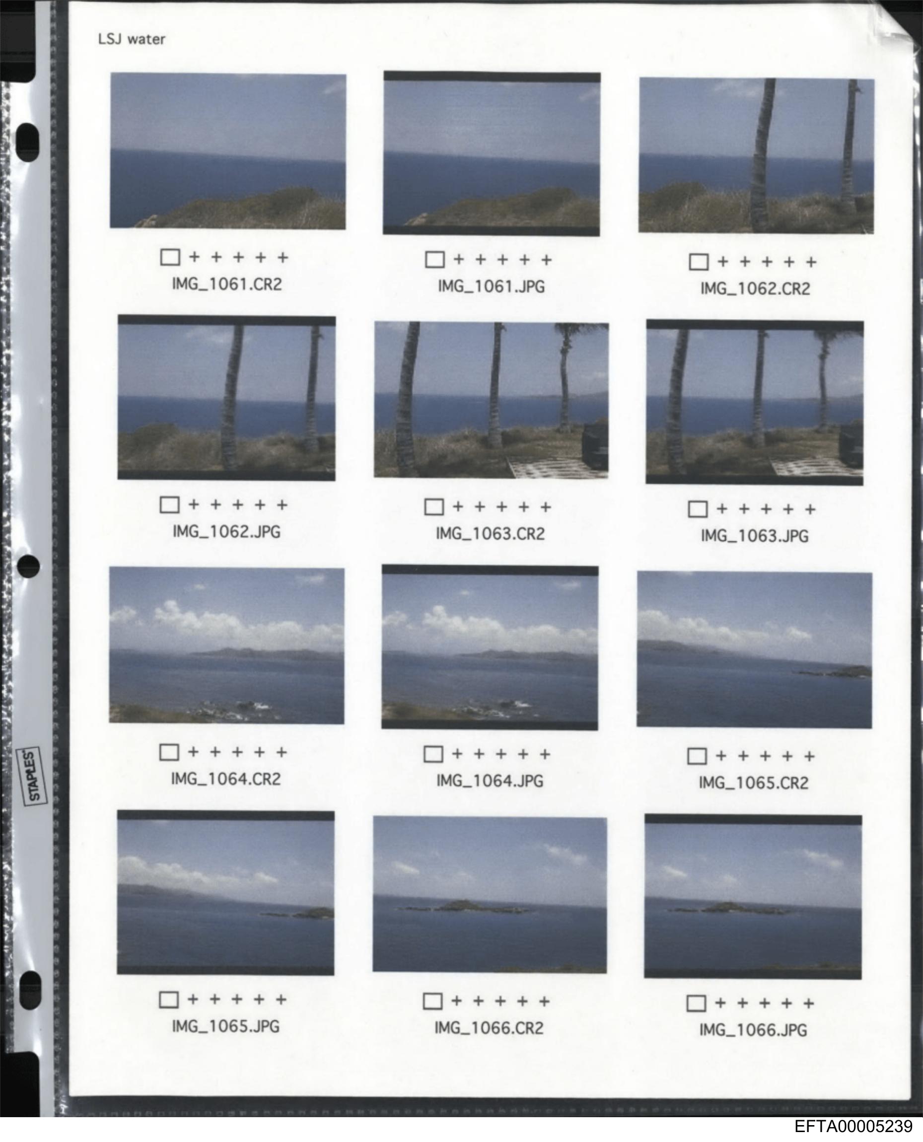 The image appears to be a collection of photographs arranged on a sheet. Each photograph depicts a similar scene: a rocky coastline with clear blue water and what looks like distant islands under a partly cloudy sky. In the upper left corner, there is text that seems to be related to photography settings or data, possibly including the shutter speed, f-stop, ISO value, and other technical information. There are no visible people in any of the photographs. The overall style suggests these could be vacation photos from a beach or coastal destination, possibly intended for presentation or sharing with others.