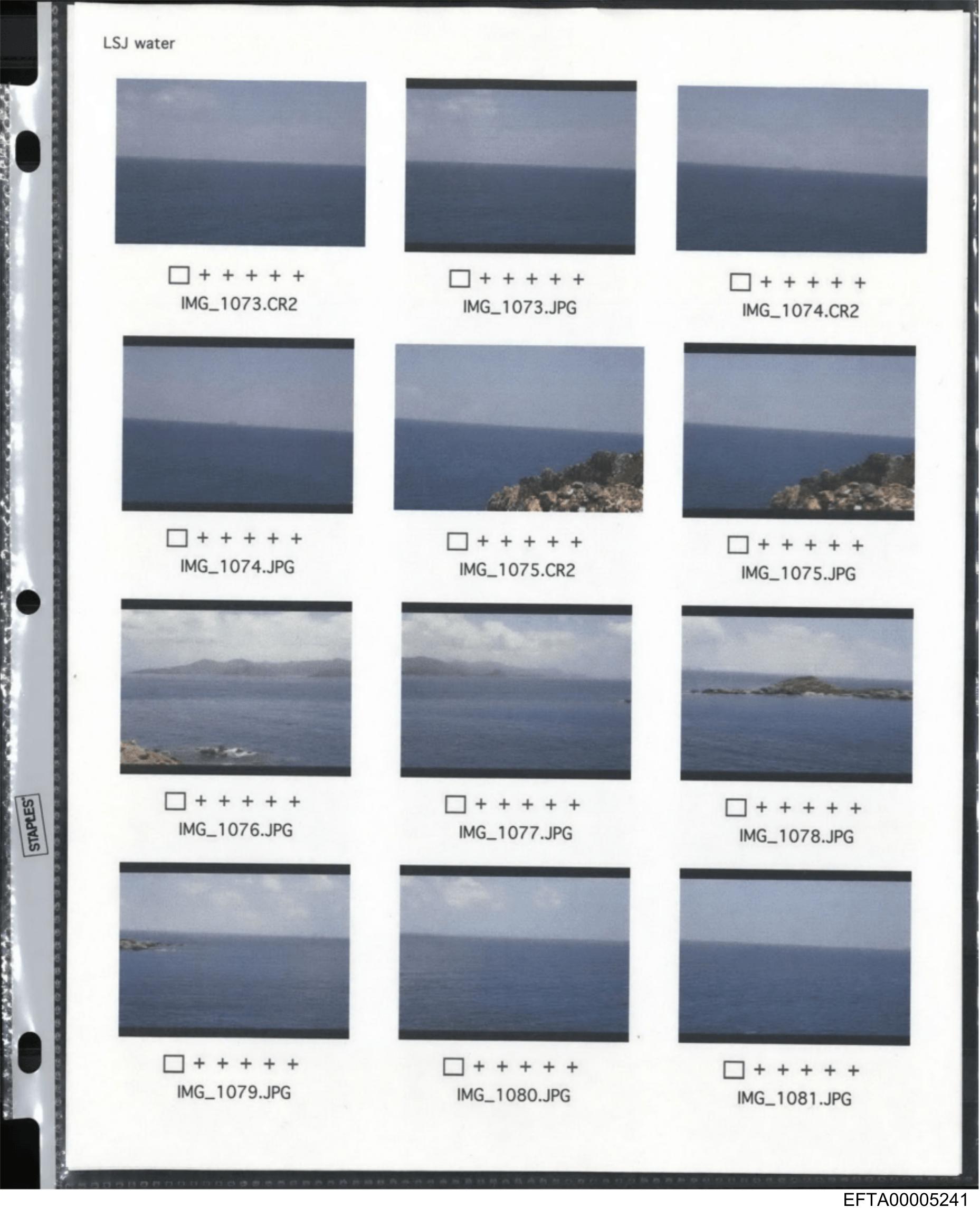 The image shows a set of nine photographs arranged on what appears to be an index sheet with perforated edges, suggesting it's part of a photo album or presentation. Each photograph depicts a different scene of natural landscapes and bodies of water, such as oceans and coastlines. The top left corner contains a logo or emblem accompanied by text that is too small to read clearly; however, there are elements like stars and other symbols that may be indicative of the organization or theme related to the photos. There is no visible human presence in any of the photographs.