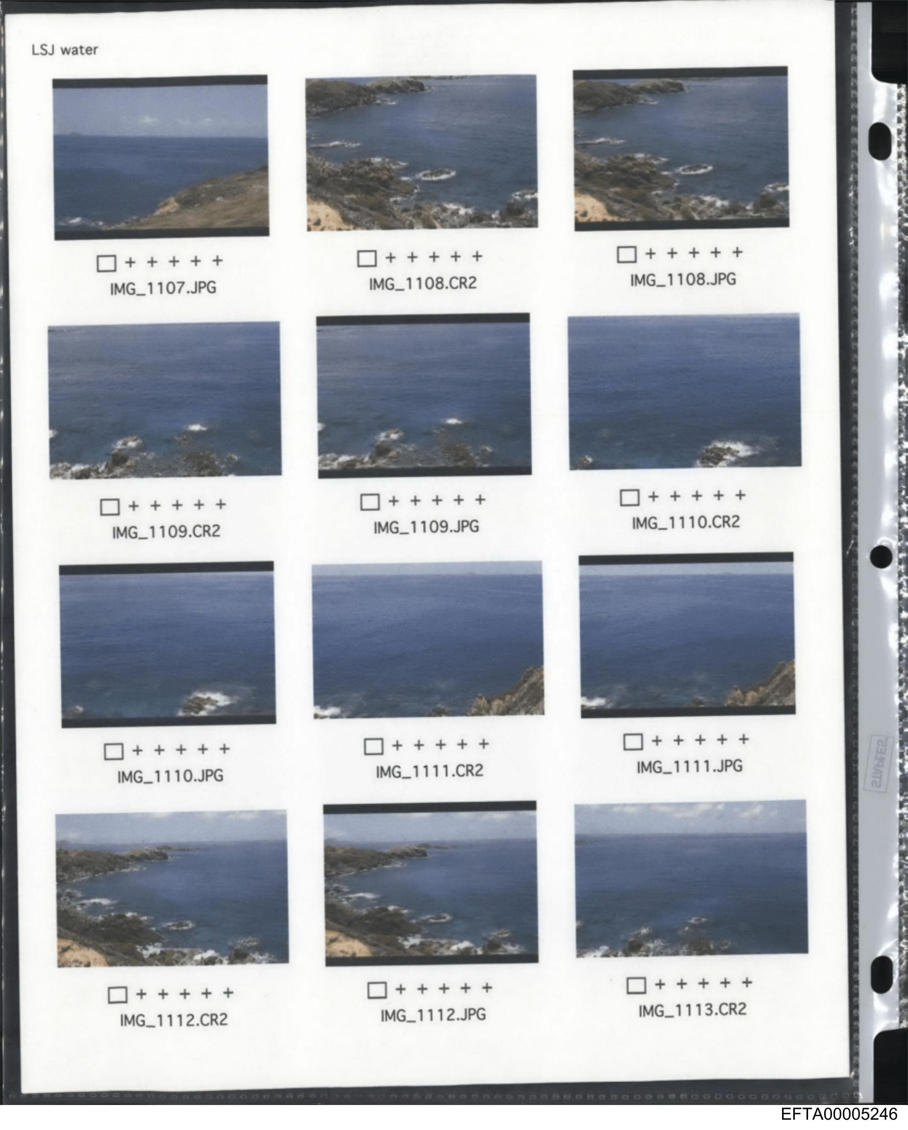 The image shows a series of photographs arranged in two rows on what appears to be a sheet of paper or film strip holder, commonly used for developing and viewing photographic negatives. Each negative displays a scenic view of an ocean with waves crashing against rocks along the shoreline. The text present on the images includes numbers ("011"), letters ("M11"), and dates ("26/07/13"), which likely represent identification or metadata for the photographs. These inscriptions suggest that the photos were taken on July 26th, and they are part of a series or album, as indicated by the sequential numbering. The ocean scenes depicted showcase natural beauty with clear skies and undisturbed waters.