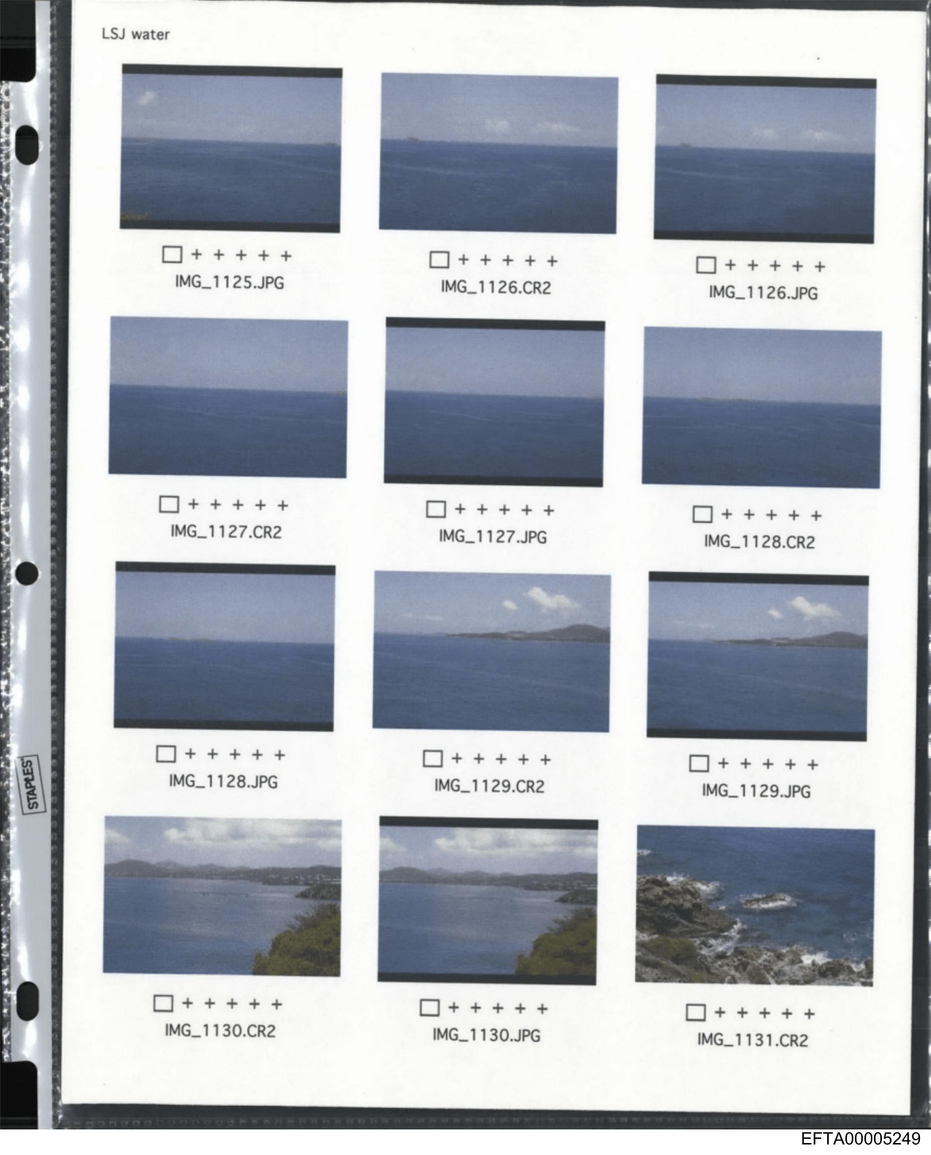 The image shows a strip of photographs with views of the ocean and coastline. The photos are aligned horizontally on a paper sleeve, which is typically used for developing and storing film negatives. There is no visible text or any identifiable people in these images. The photographs depict various coastal scenes under different lighting conditions, suggesting they were taken at different times of day or under varied weather circumstances. The ocean appears calm with minimal waves, and the sky has a mix of cloud cover and clear patches.