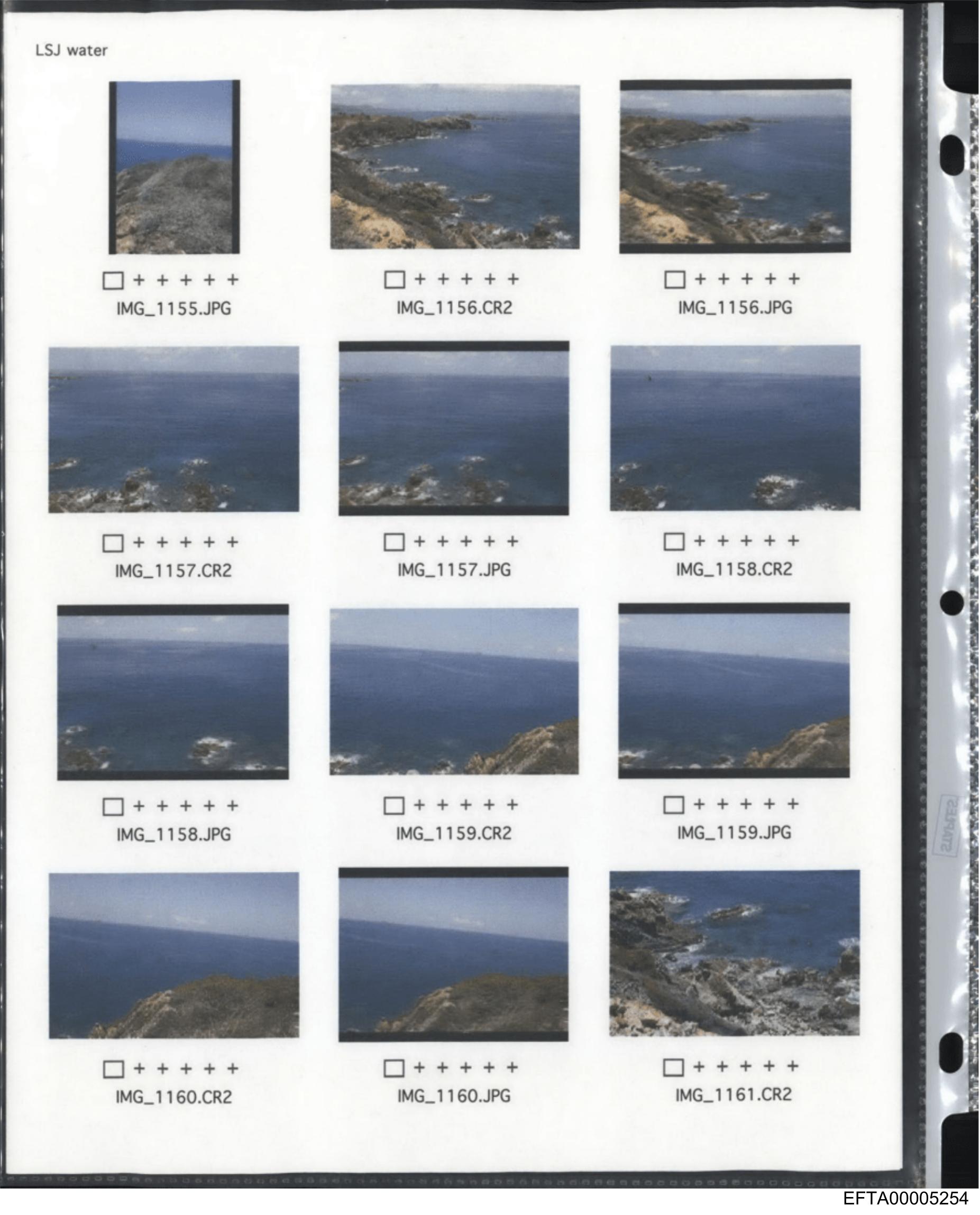 The image shows a collection of small photographs attached to a white paper strip, similar to what one might find in an album or exhibit. Each photo depicts the same scene, which appears to be an aerial view of a coastline with rocks and vegetation leading down to the water's edge. The ocean is visible in all photos, suggesting different moments captured at the same location. There are also numbers and letters printed on each photo border, but without additional context, their significance isn't clear from the image alone.