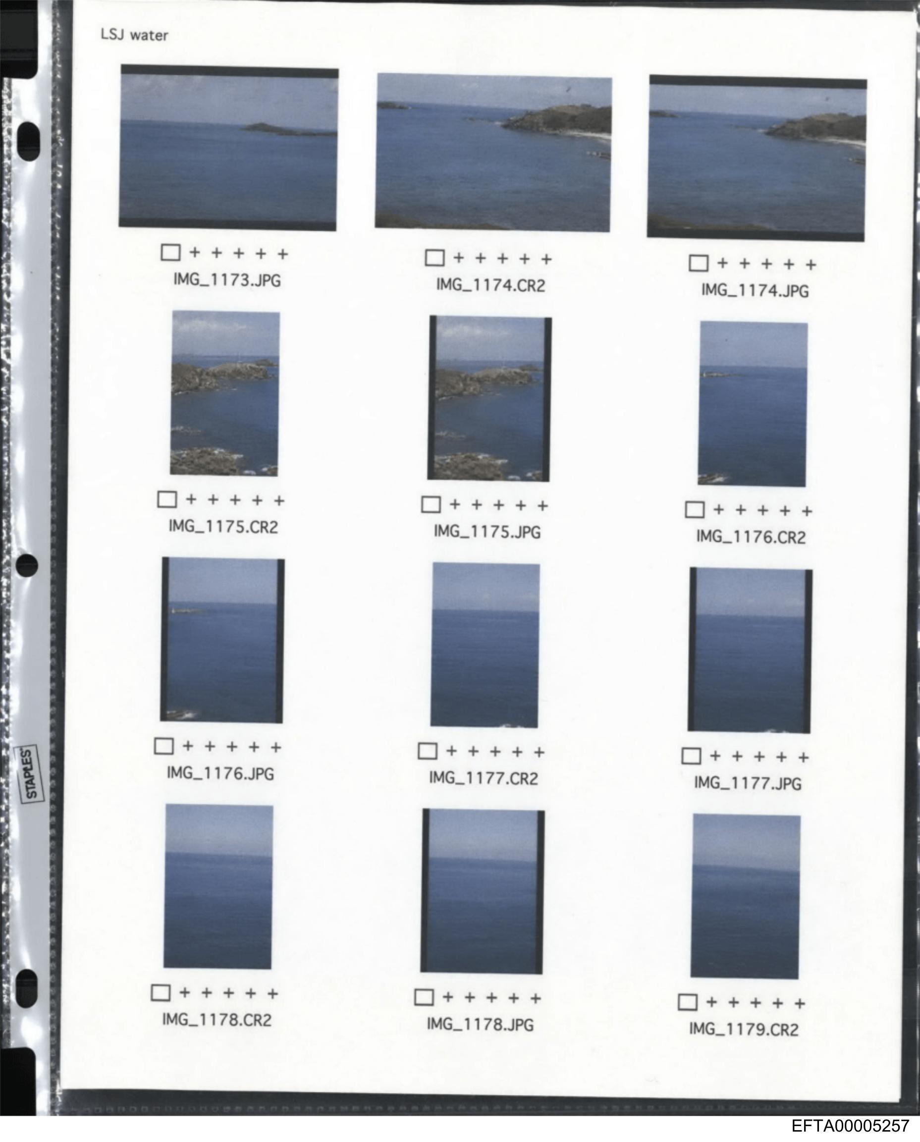 This image appears to be a collection of photographs with annotations taped onto them. The visible photo shows a serene landscape of water with islands and a clear sky. There is no visible text on the images themselves but instead, there are handwritten notes attached to each picture. These notes seem to provide information about the photos, such as their identification numbers (like "M1") and possibly their file names or titles (like "Island"). The overall layout suggests that these photos may be part of a review or presentation process, with annotations used to convey additional context or details about each photograph.