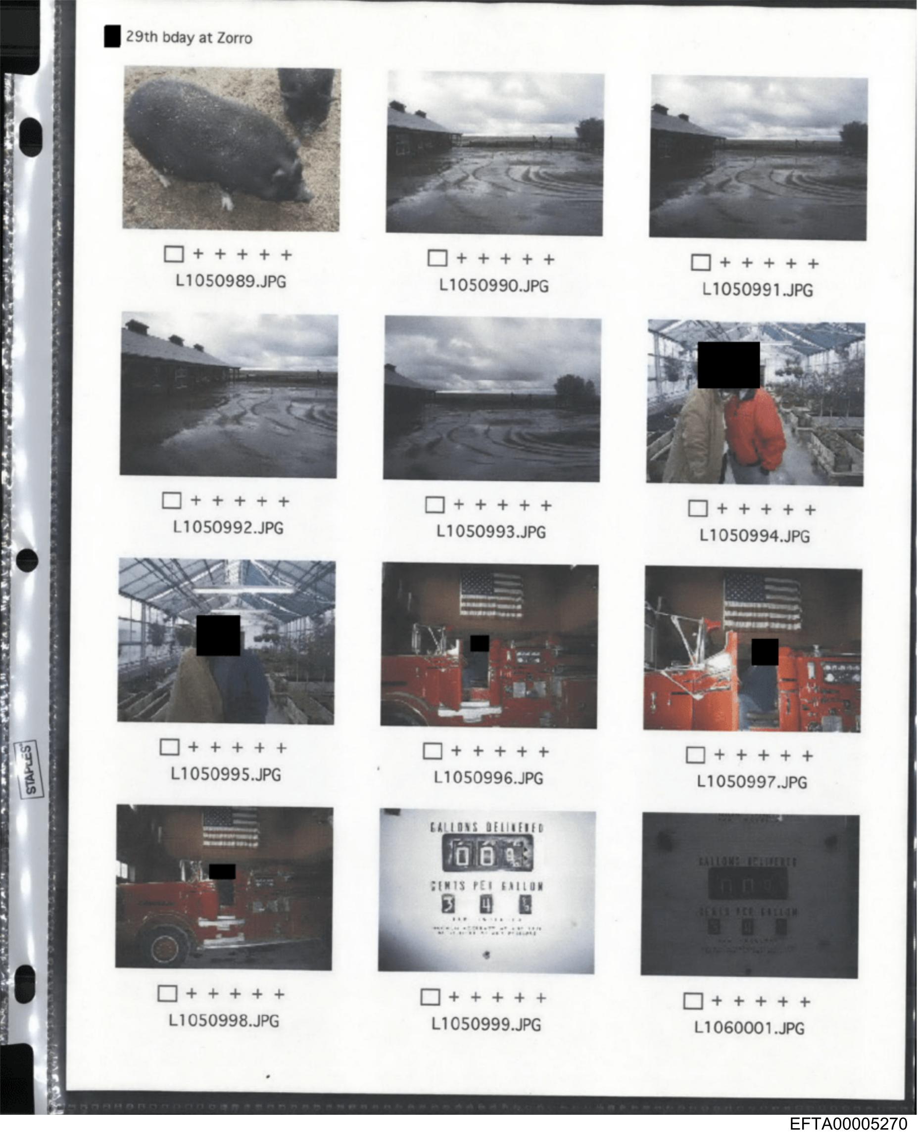 The image shows a collection of photographs on what appears to be a sheet typically used for photo identification purposes, such as a mugshot book. Each photograph is accompanied by a handwritten number and stars next to it, indicating some sort of rating or importance assigned to each individual in the pictures. The photos depict various scenes, including people engaged in different activities like driving vehicles, standing outside, and one image shows what seems to be an animal. There is no visible text that provides context or identification details about the individuals pictured or their locations.