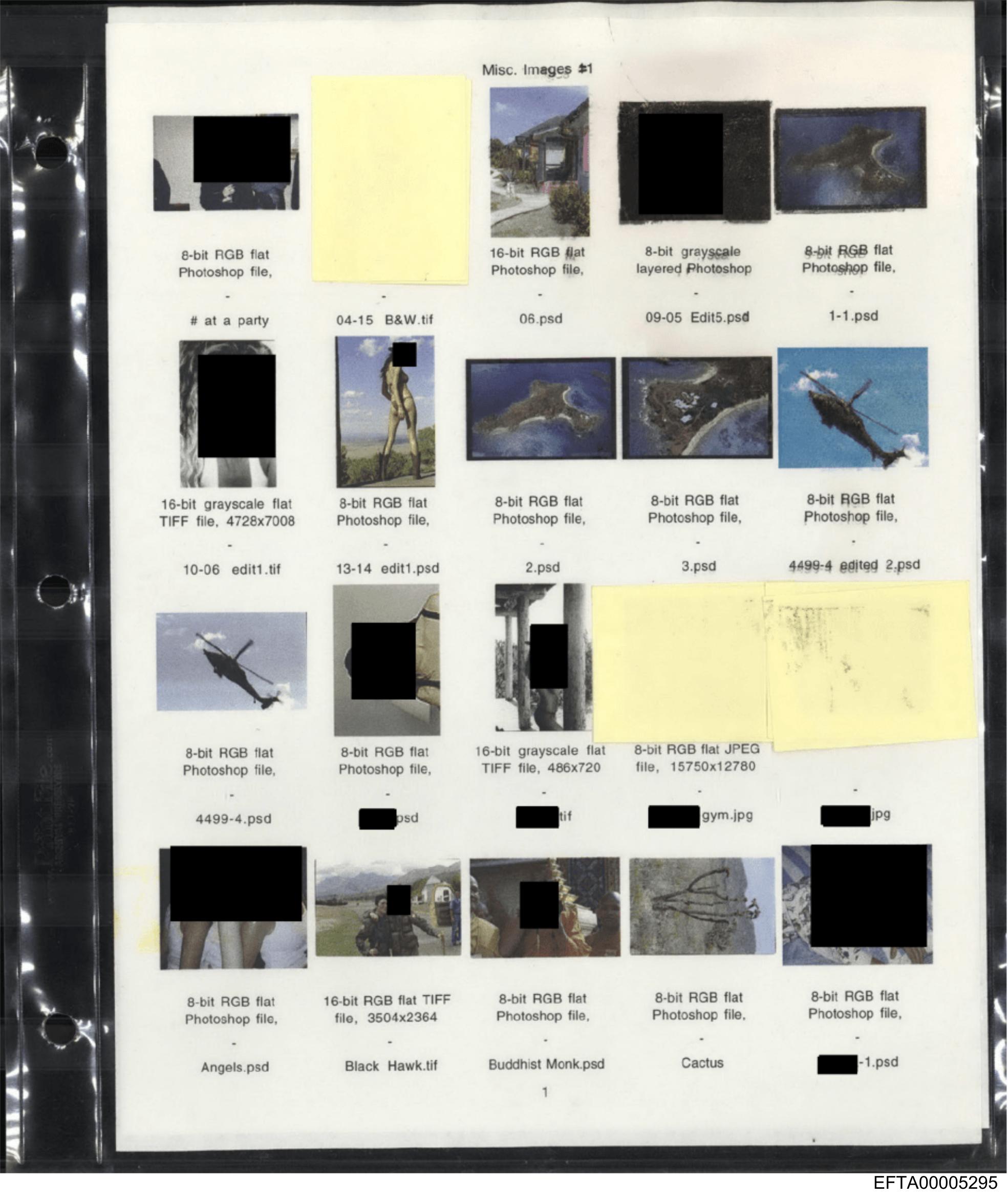 The image shows a document with multiple photographs pasted on it, each accompanied by a description or caption. The photos appear to be of various scenes and activities. Some descriptions include the names "John Doe" and "Jane Doe," which are often used as placeholders for real people in documents. The text is partially obscured and redacted, with certain sections marked with "[REDACTED]" indicating that sensitive information has been intentionally hidden or removed from view.