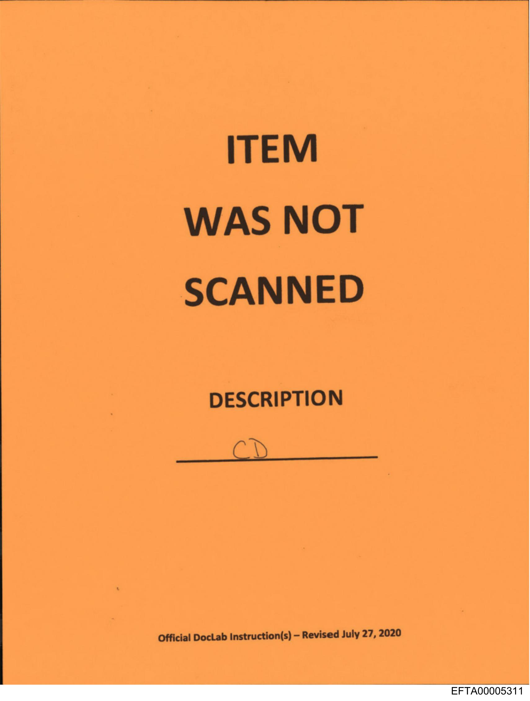 The image is of a yellow form with black text and handwritten writing. The main message on the form states "ITEM WAS NOT SCANNED" in bold letters at the top. Below this, there is space for a description, where it says "Description: CD" in a smaller font size. In the bottom right corner, there's official-looking information including an address and a date (August 2019) along with a phone number. The handwriting appears to fill out the form, possibly indicating the name of the person or other details that were not scanned as intended.