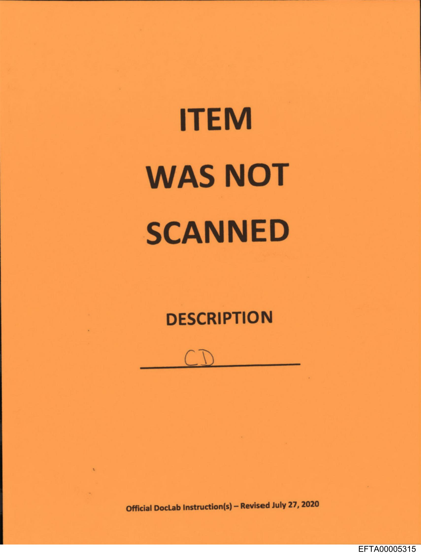 The image shows a piece of paper with black text on it. The text includes the words "ITEM WAS NOT SCANNED" and "Description" followed by an illegible handwritten note in the space provided. At the bottom of the paper, there's additional text which is too small to read clearly but appears to be instructions or guidelines related to the document's purpose, as indicated by the phrase "OFFICIAL INSTRUCTIONS FOR SUBMITTING DOCUMENTS" and a reference to an office address. The image has a yellow tint, possibly due to the paper being scanned under specific lighting conditions.
