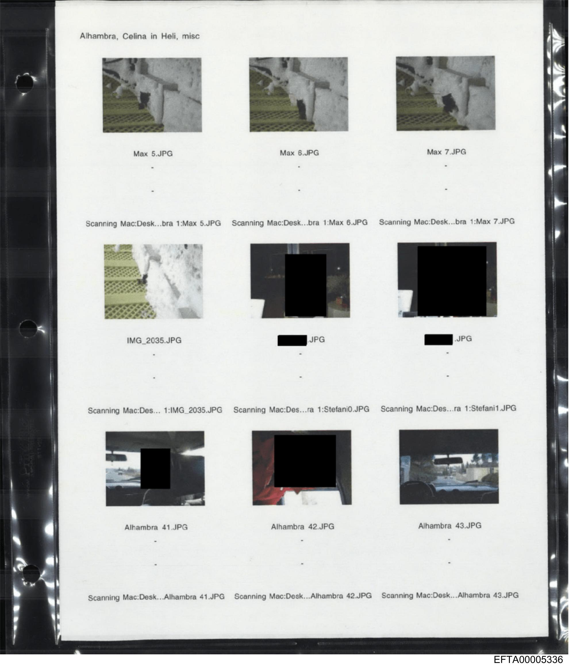The image shows a document with various images and text annotations. There are eight photographs placed within the document, each accompanied by blacked-out areas covering parts of them. The text on the document appears to be organized into columns, with one column dedicated to descriptions or comments about the images. The visible text includes phrases such as "Camera 1", "Camera 2", and "Camera 3", indicating that these are likely references to different camera perspectives or types within a surveillance or monitoring system. The photographs show various indoor scenes, including rooms with furniture, staircases, and hallways. The document is structured in such a way that it seems to be a manual, report, or informational guide related to security cameras and their usage or positioning within a specific location.