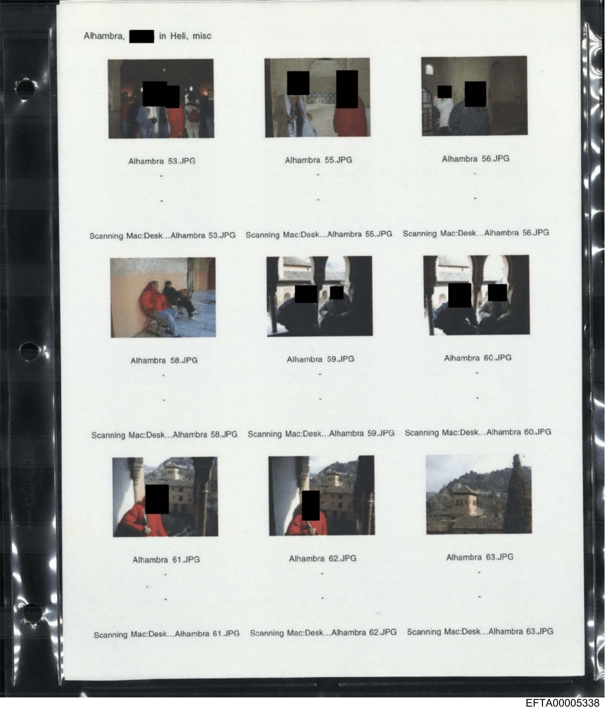The image displays a piece of paper with several small photographs arranged in rows. The photos appear to be personal snapshots, showing various scenes and individuals that might represent family or travel memories. The paper seems to have been placed on an object with some text visible but partially obscured at the top. Due to the resolution and angle of the photograph, it's difficult to discern specific details about the people, locations, or objects in the small photos. The main focus is on the collection of photographs itself rather than any individual image within them.