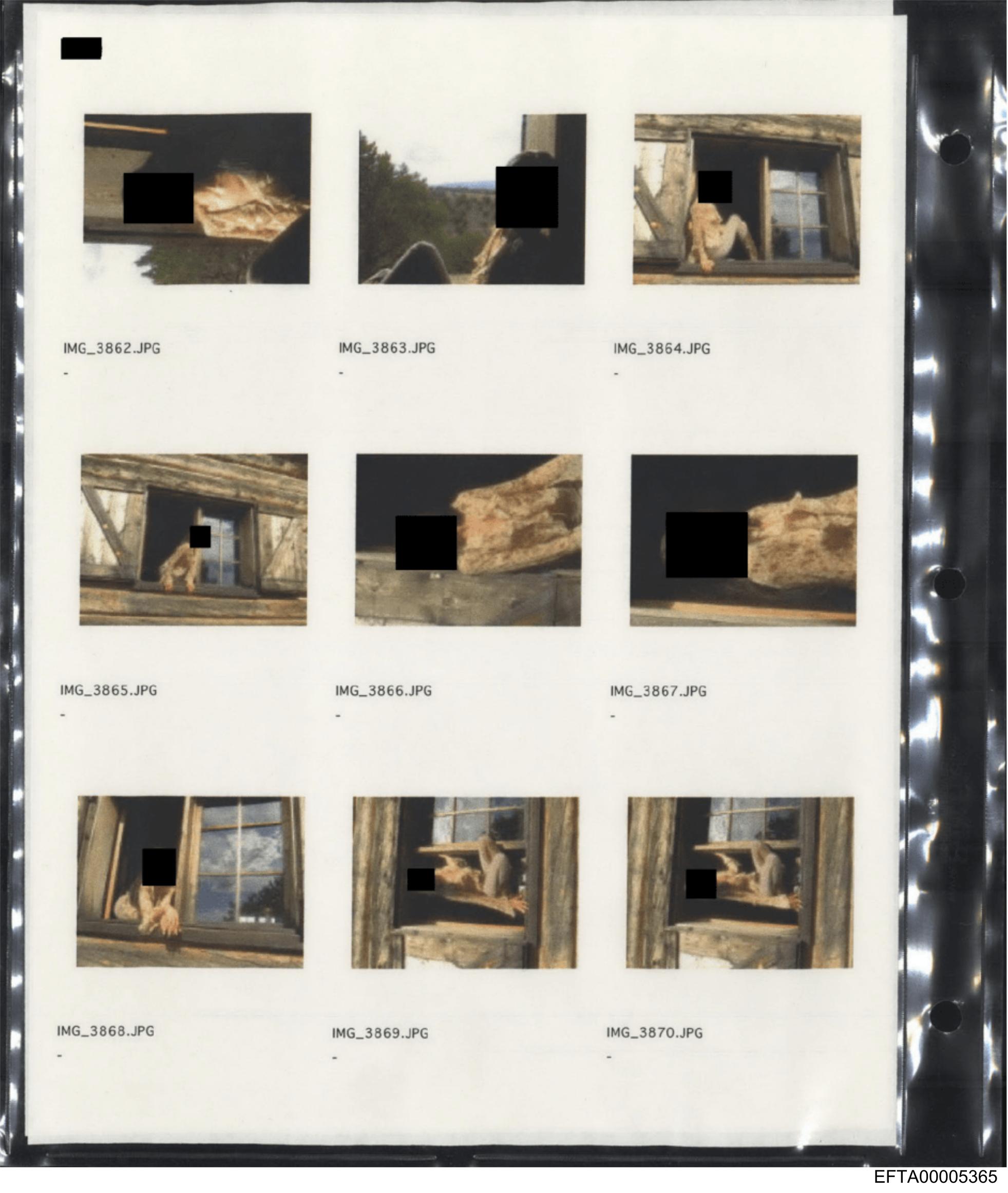 The image displays a collection of photographs arranged in a grid pattern, enclosed within what appears to be a lightbox or similar display case with transparent sides. The focus of the images seems to be on scenes that include windows and doors, possibly depicting architectural elements or interior spaces. Each photograph is bordered by a thin white line, and there are red rectangles overlaid across some areas of the images, likely indicating points of interest or areas requiring attention for editing purposes. No text is clearly visible in the provided description.