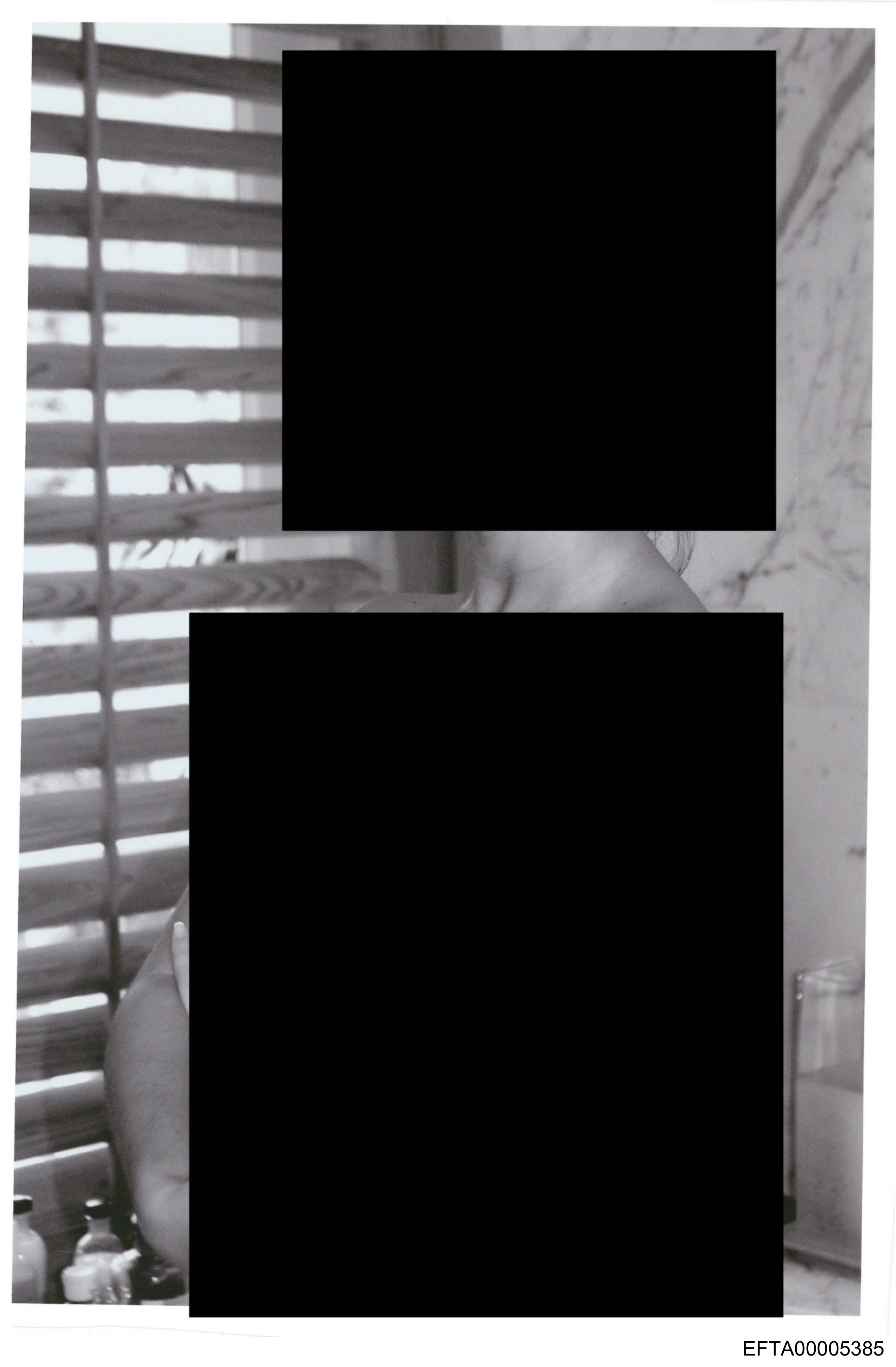 The image appears to be a vertical photograph that has been altered for privacy purposes, likely by using digital tools to obscure the central figure and their immediate surroundings. The person in the middle is covered with a large black rectangle, suggesting they are the focal point of this scene but have been intentionally hidden from view. This may indicate a desire to protect their identity or maintain a level of discretion regarding their presence in the photo. The environment surrounding the central figure seems to be an interior space, possibly a room with a window visible in the background. The window has horizontal blinds that are partially drawn open, allowing some light into the space. There is no visible text in the image. The style of the photograph suggests it might have been taken casually without staging or professional intent.