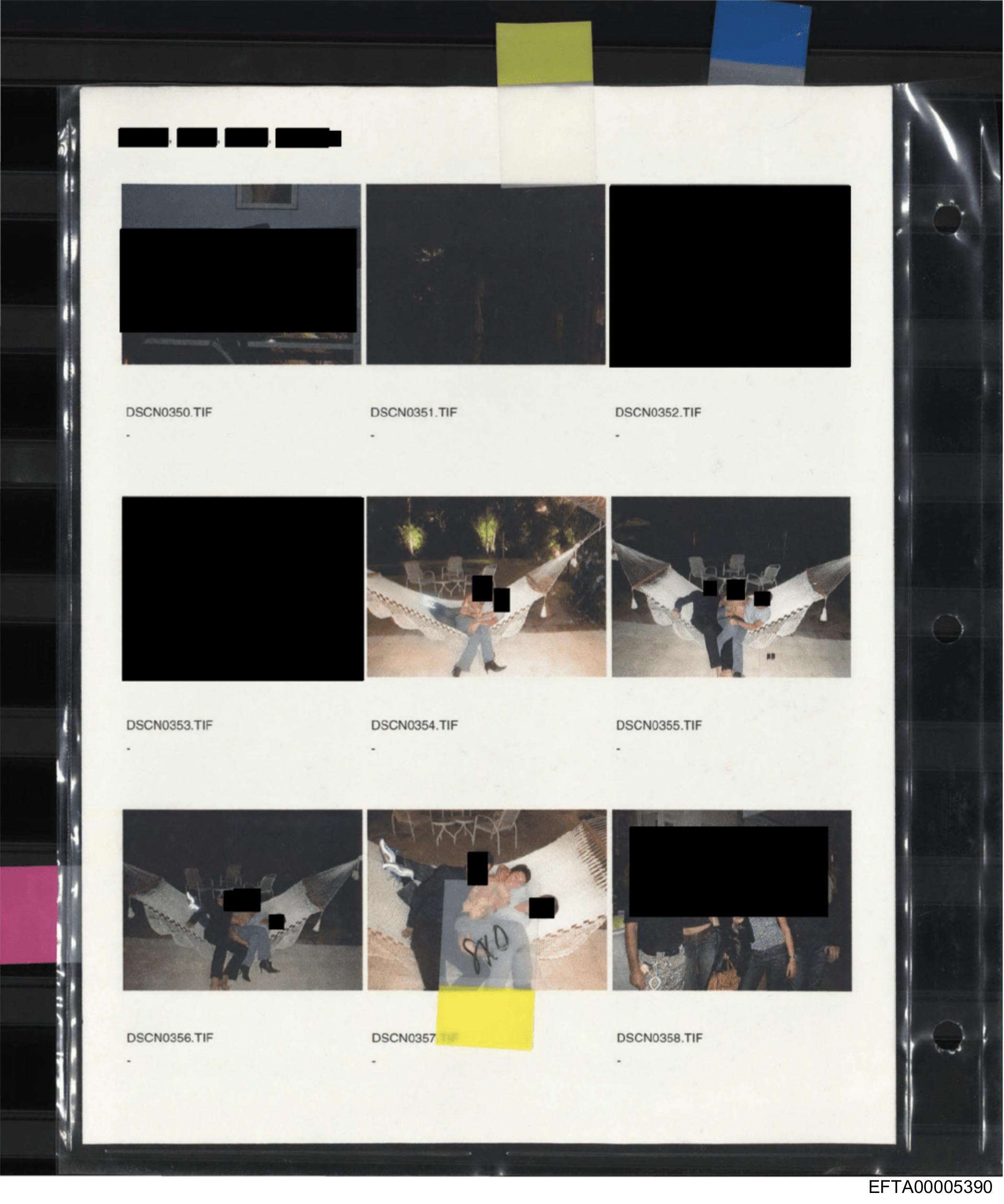 The image displays a collection of six photographs arranged in two columns of three, mounted on a backing that appears to be a transparent plastic sheet with tabs along the top edge for securing it to a board. Each photograph is accompanied by text annotations, although these texts are obscured and not clearly legible due to the resolution of this particular image. The central focus of the photos seems to be a person in each frame, engaged in various activities or settings that are not entirely visible due to the blacked-out areas. In one of the pictures, a human figure is partially visible, suggesting that some content has been deliberately concealed by covering it with a dark, rectangular shape. The style of the image suggests it could be part of an exhibition or presentation where privacy concerns have led to the censorship of certain parts of the photographs. The overall impression is one of a controlled display meant for a specific audience or context.