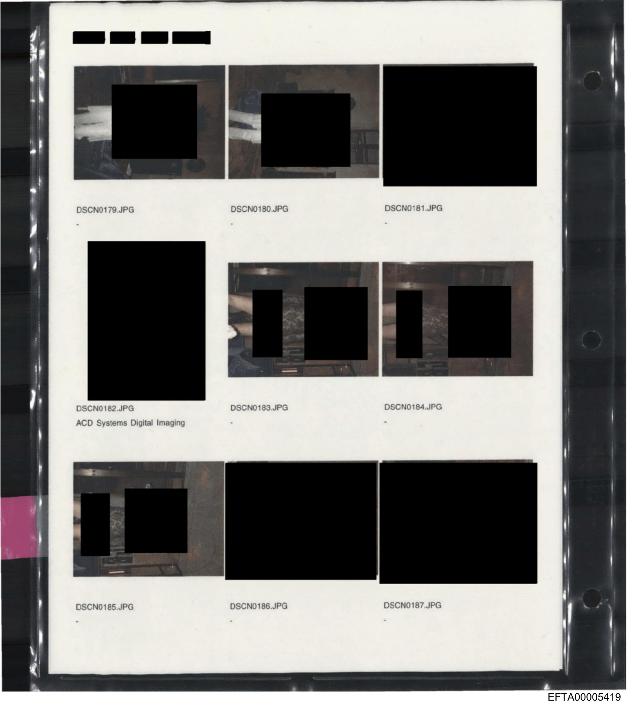 The image shows a piece of paper with multiple photographs placed on it. The photographs are predominantly dark and appear to be taken from a video screen due to the reflection and glare visible in each one. The background is out of focus but seems to be an interior setting, possibly a room with artificial lighting. There are several pieces of text overlaying some of the photos, although the content is not legible in this description. The style of the image is candid, with no people or notable locations identifiable due to the low resolution and darkness within the images themselves.