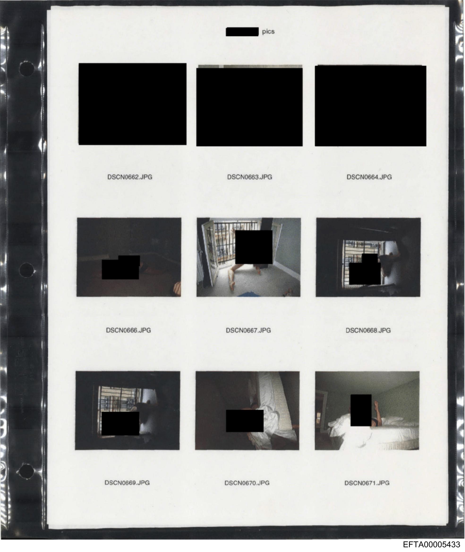 The image you've provided appears to be a collection of photographs within another photograph, possibly a display case. The photos are arranged in two rows and seem to depict an indoor setting with dim lighting. Each photo has been edited with a red 'X' over it, indicating that the content is not intended for viewing or publication. There is no visible text providing additional context or information about the images within this display. The overall style of the image suggests it might be related to a news story or an exhibit showcasing sensitive material.