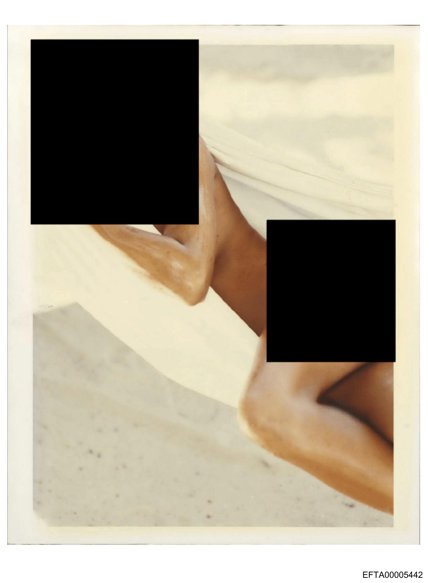 The image shows a photograph within another photo. The outer photograph has a faded quality, and the central figure is obscured by several black rectangles of varying sizes, placed across different parts of the body, presumably to obscure sensitive information. This gives the impression that the inner photograph could be of someone lying down in what appears to be an outdoor setting, possibly on a sandy surface. The style suggests it might be from a magazine or newspaper article due to the overlay text and placement within another frame, but the specific context is not clear from this image alone.