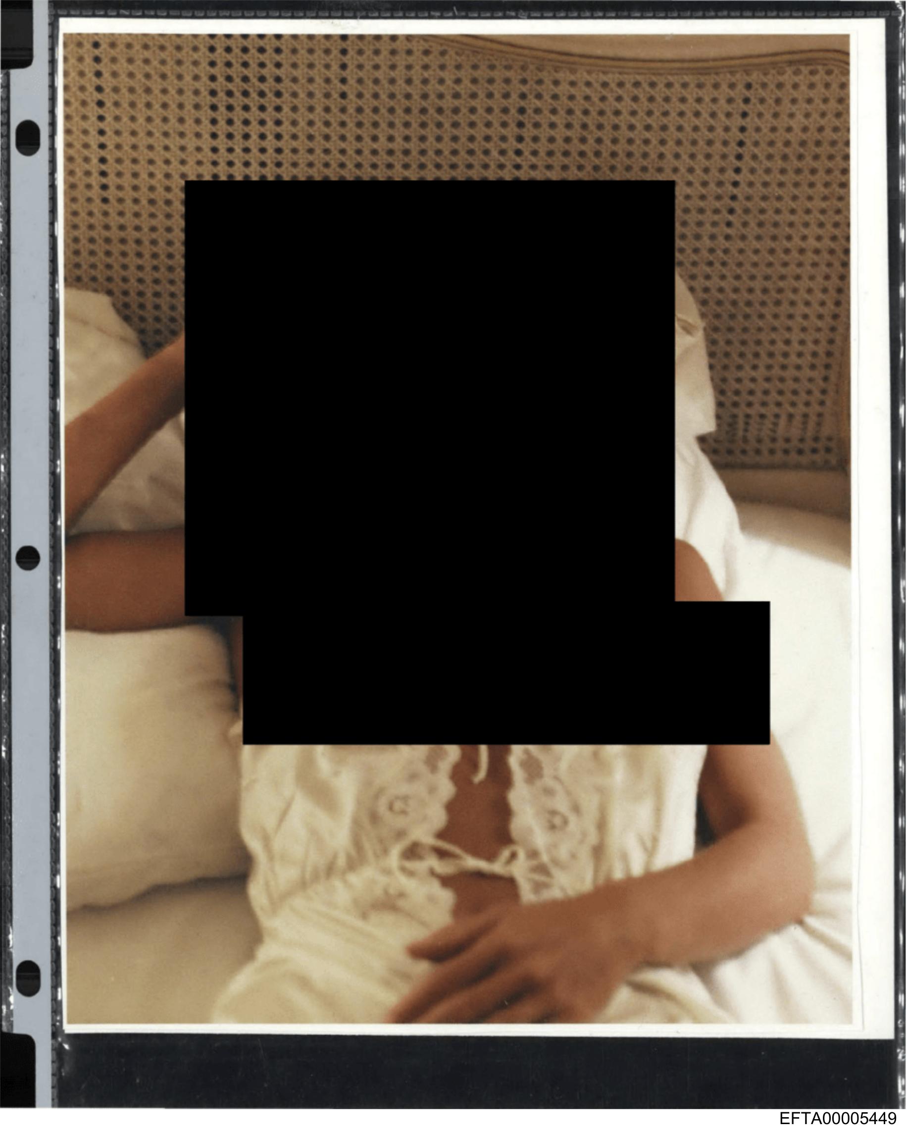 This is a black and white photograph featuring a person who appears to be lying down, only the upper part of their body visible above a bed. The individual's face has been obscured by what looks like a digital overlay, possibly for privacy or artistic purposes. They are wearing an outfit that includes lace elements and have their arms slightly raised near their head. There is no text present in the image to provide additional context. The overall style of the image suggests it could be a film still, given the presence of sprocket holes at the bottom edge, which resemble those found on celluloid film stock.