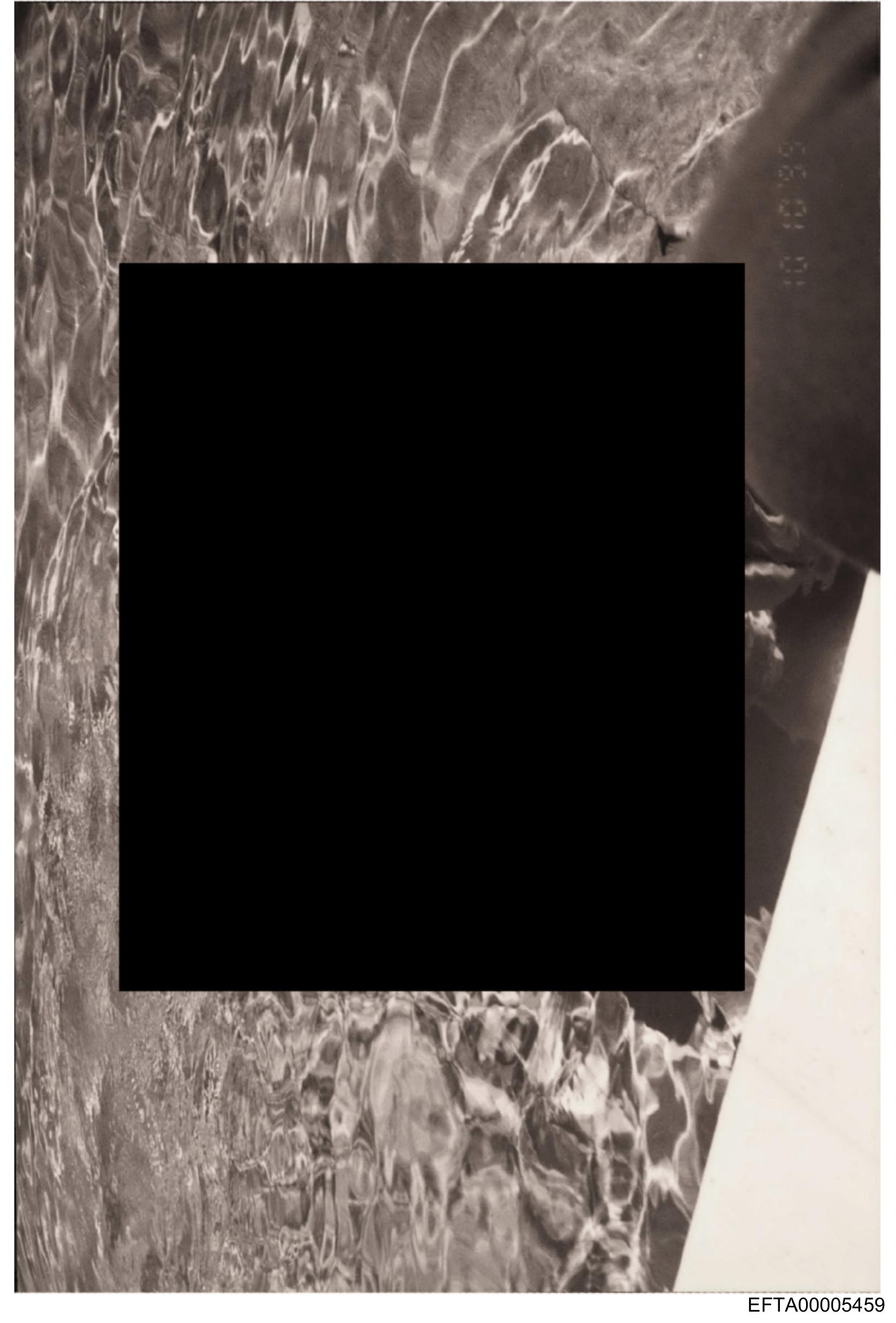 The image is a black and white photograph showing an outdoor scene with flowing water, possibly from a river or stream. In the center of the image, there's a blurred rectangle that appears to be a censorship bar, covering what might have been text or an object deemed sensitive or inappropriate for display. The background includes elements like rocks and vegetation, contributing to a natural setting. The edges of the image are visible with a white border, suggesting this could be a page from a book or a section of a larger document.