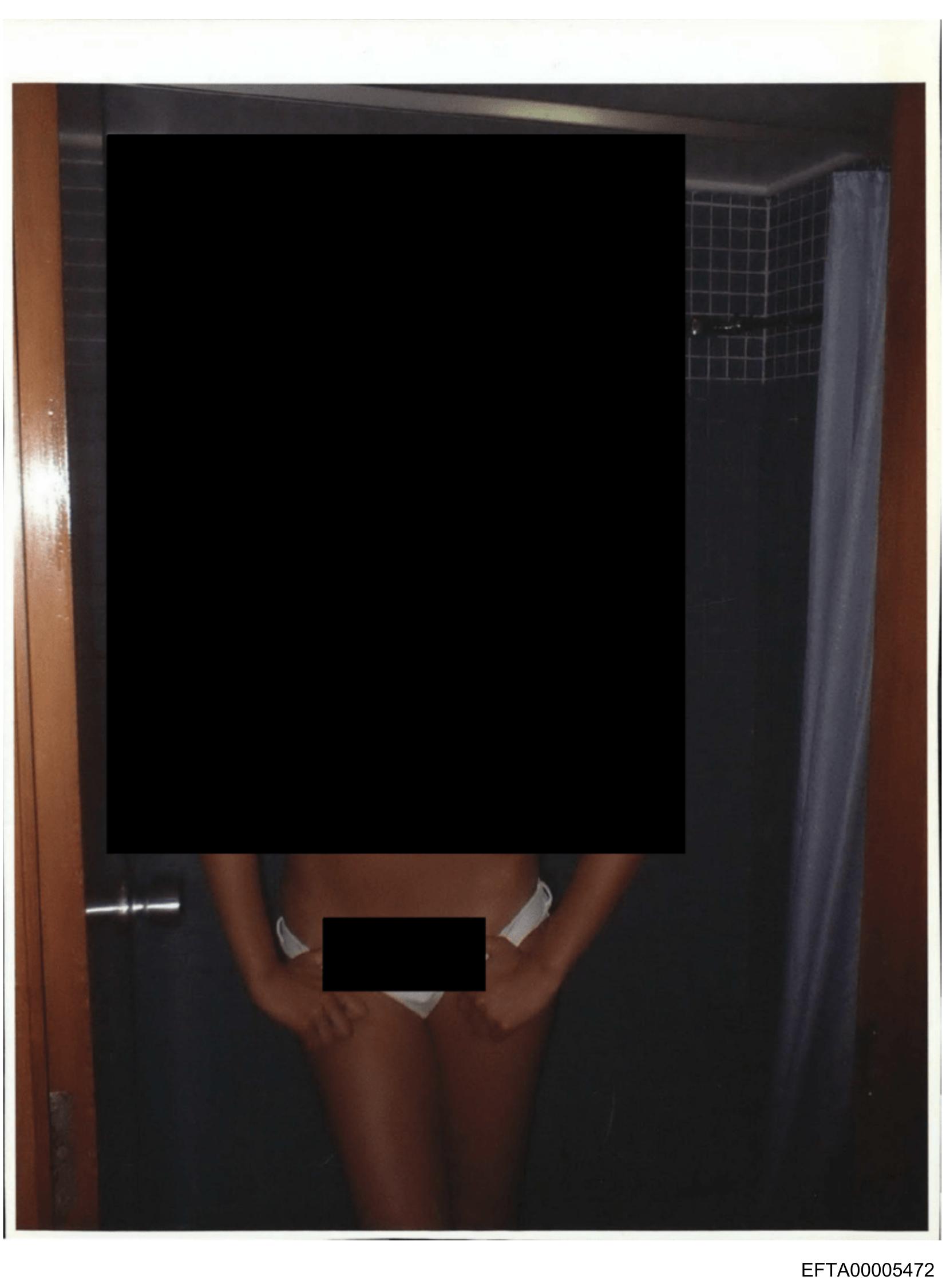 The image shows a person standing inside what appears to be a bathroom stall with their lower body visible. They are wearing white swimwear and have their hands placed on their hips. The person is looking directly at the camera. Their upper body and head are not visible in the frame, as they appear to be behind a partition or out of focus. There's no text present in the image, and it doesn't provide any specific information about the location beyond the interior setting of the bathroom stall.