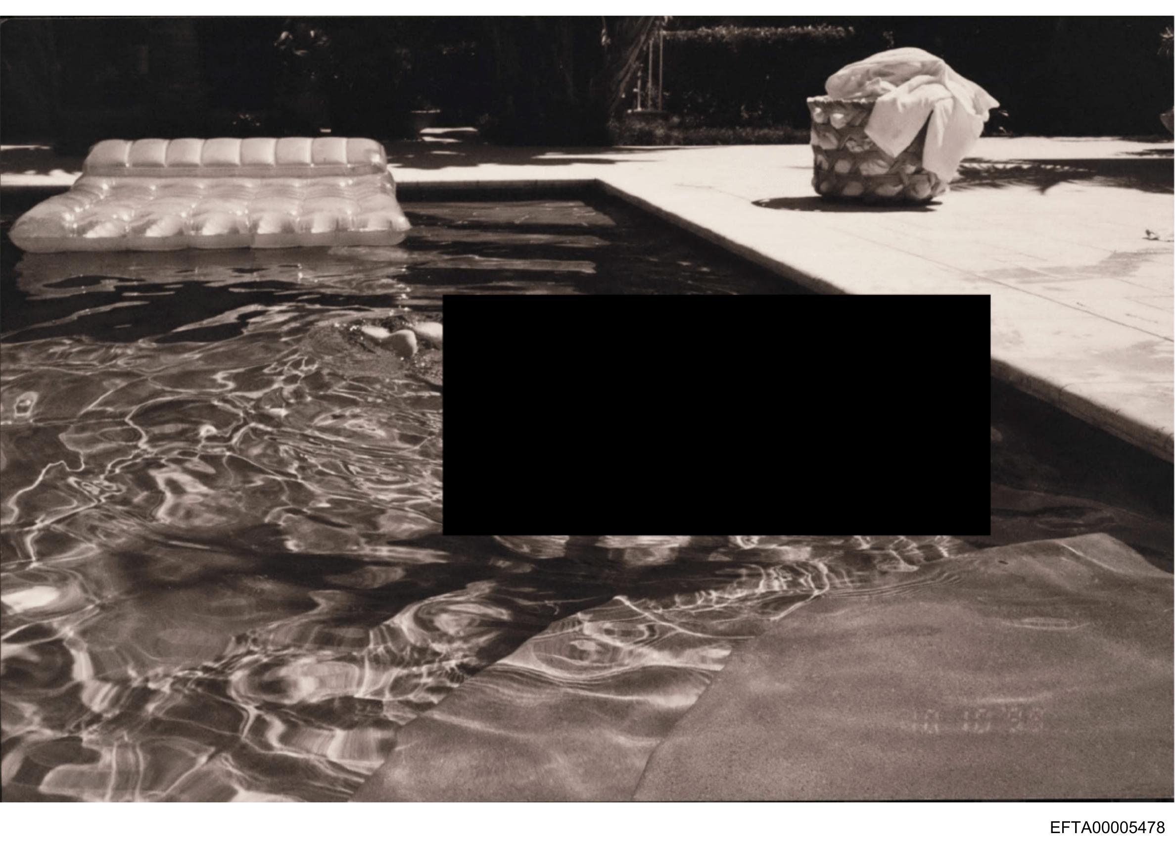 The image shows a pool scene with water ripples indicating movement or wind on the surface of the water.