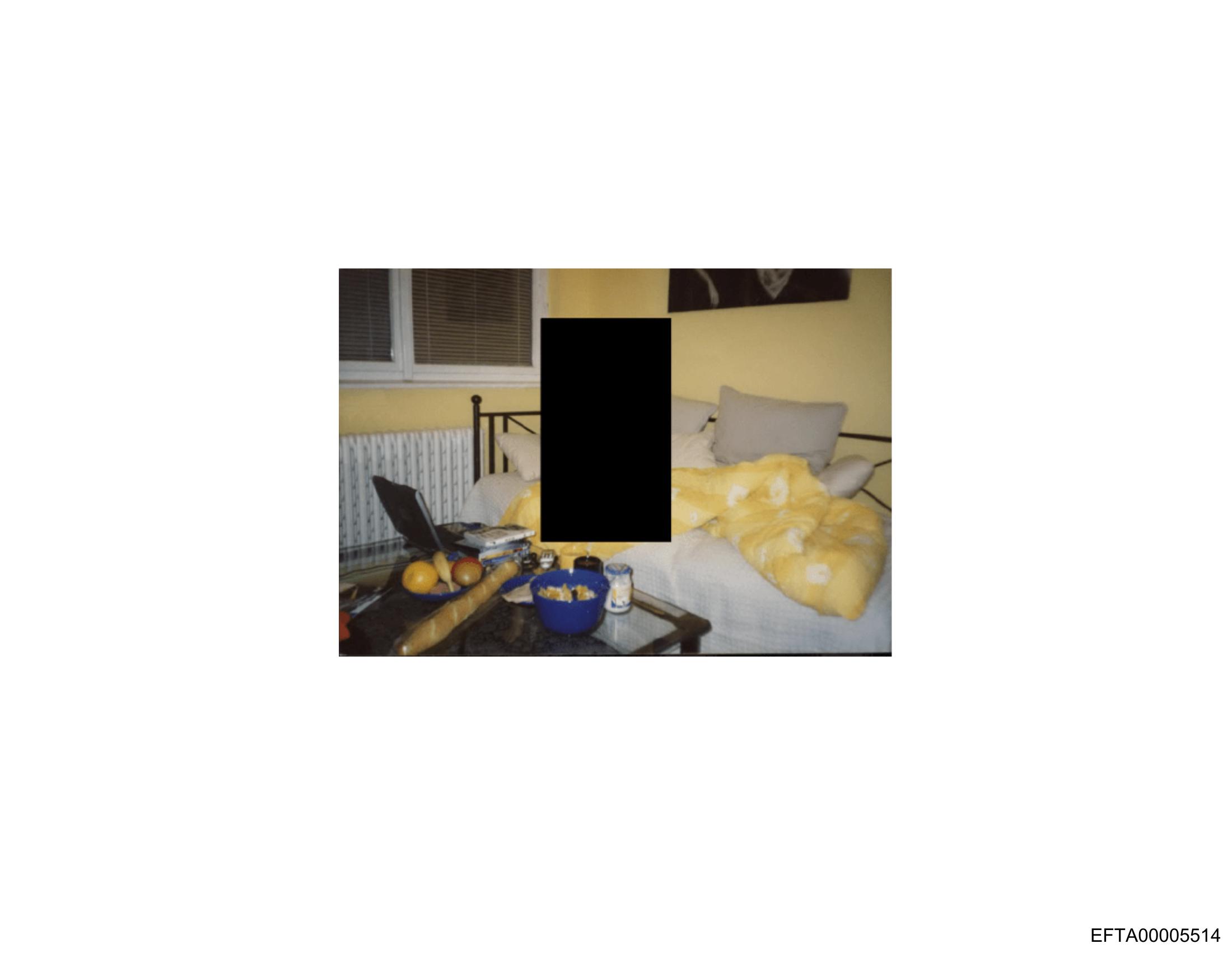 The image appears to be a screenshot from a video call, as indicated by the low resolution and pixelation typical of digital communication platforms. It shows an indoor setting with a bed in the background. A person is partially visible on the right side of the frame, but their identity is obscured by a blurred face mask emoji, which suggests they are covering or censoring their face during the call. The individual seems to be seated and there's an object on the bed resembling a pillow or a soft toy with a yellowish color.