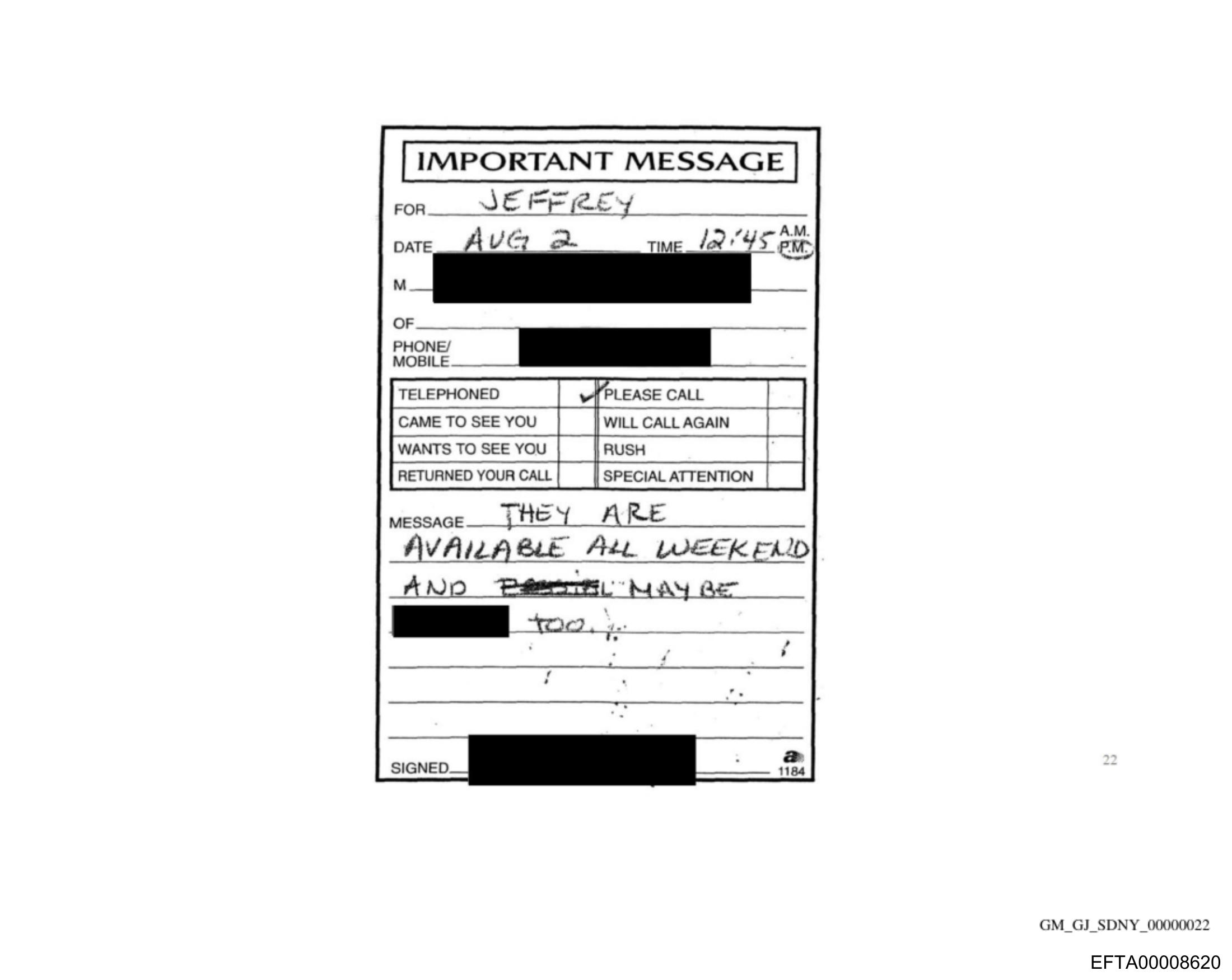 The image depicts a printed message that appears to be an important notice for a person named Jeffrey. The message instructs him to call the number provided as soon as possible due to unforeseen circumstances. It is indicated that there will be additional information available all weekend and specifies that they are too late to call this time, so he should do so at his convenience next week. The notice includes a phone number with an area code of 914, which corresponds to the White Plains metro area in New York State. The background of the message has been altered or obscured by black marks, making it difficult to discern any additional details that may have been present on the original document.