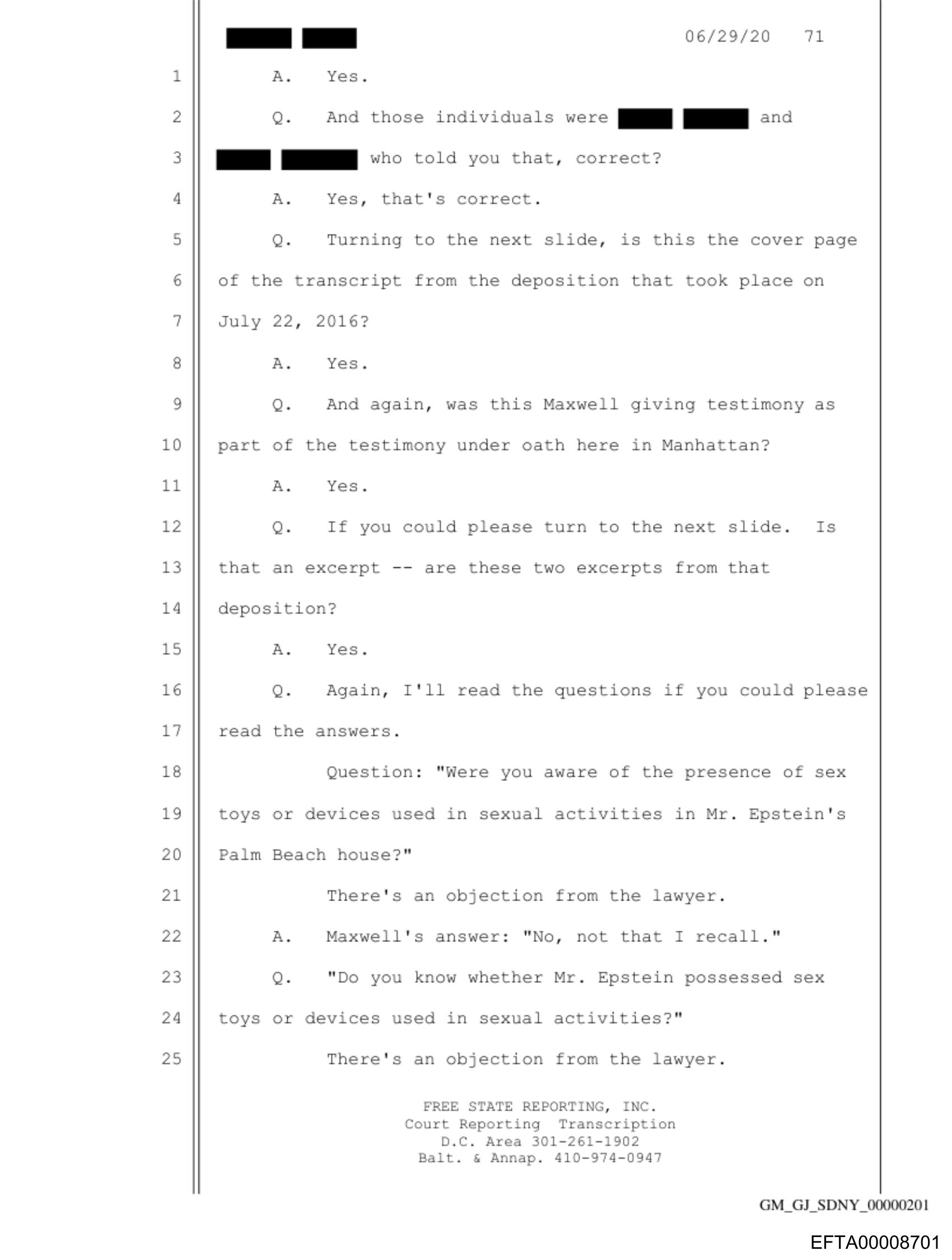 The image appears to be a photograph of a printed document or transcript with handwritten annotations on it. The majority of the content is obscured by black marks that prevent legibility. However, there are sections where the text is visible, including phrases such as "Q. Do you remember if he talked about the next date of his cover page?" and "A. No." This suggests that the document may be a record of an interview or legal proceeding with questions (Q) and answers (A) being recorded. The overall appearance is that of a piece of evidence related to an investigation, possibly due to its context and markings.