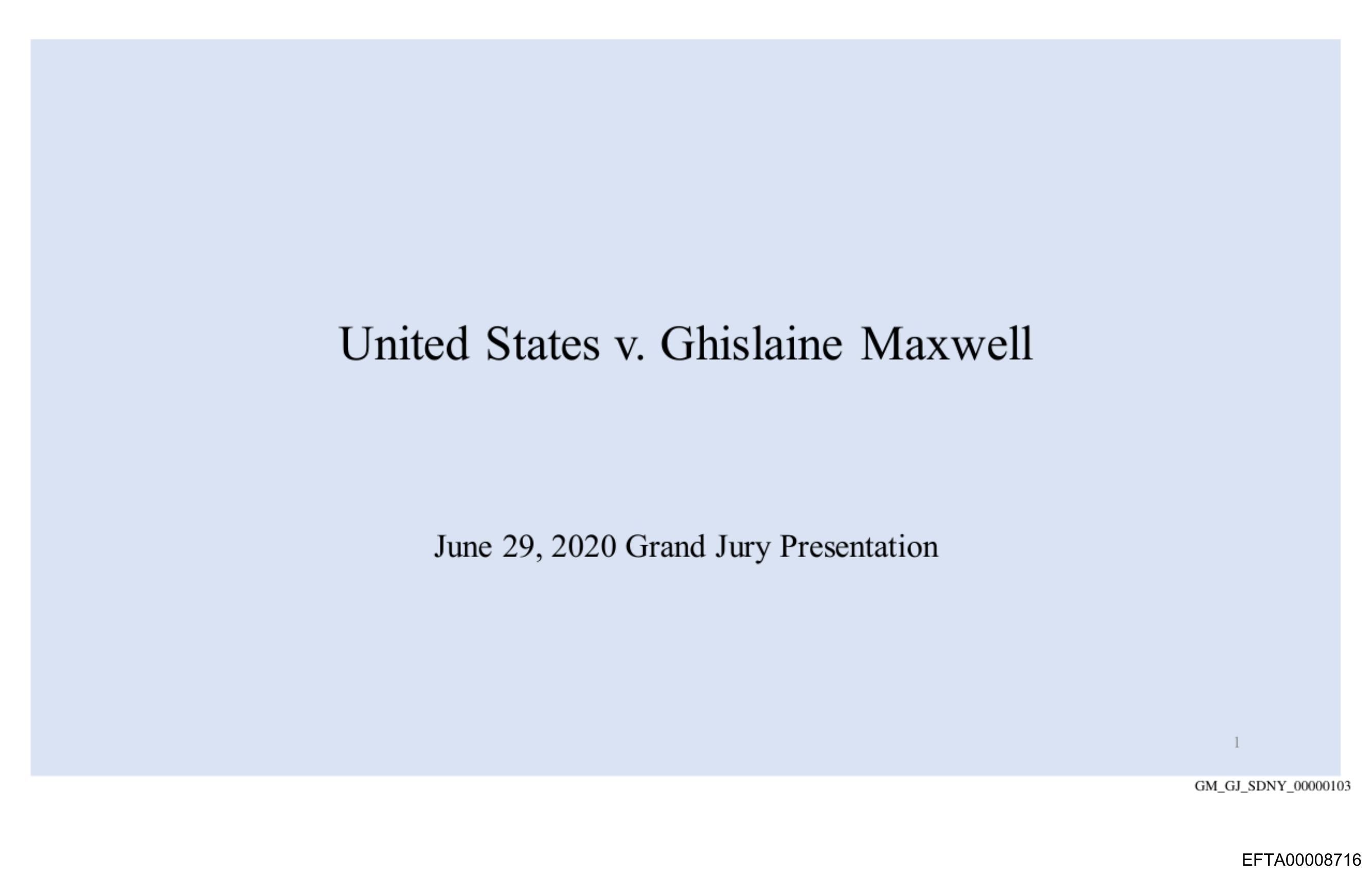 The image displays a screenshot of a virtual court proceeding for the case "United States v. Glisiane Maxwell" scheduled on June 29, 2021 at 10:00 AM. The text provides information about the date and time of the Grand Jury presentation. There are no visible people or locations in this image, as it is a digital representation of an online court document. The significant object in the image is the text providing details about the legal case and its upcoming proceeding.