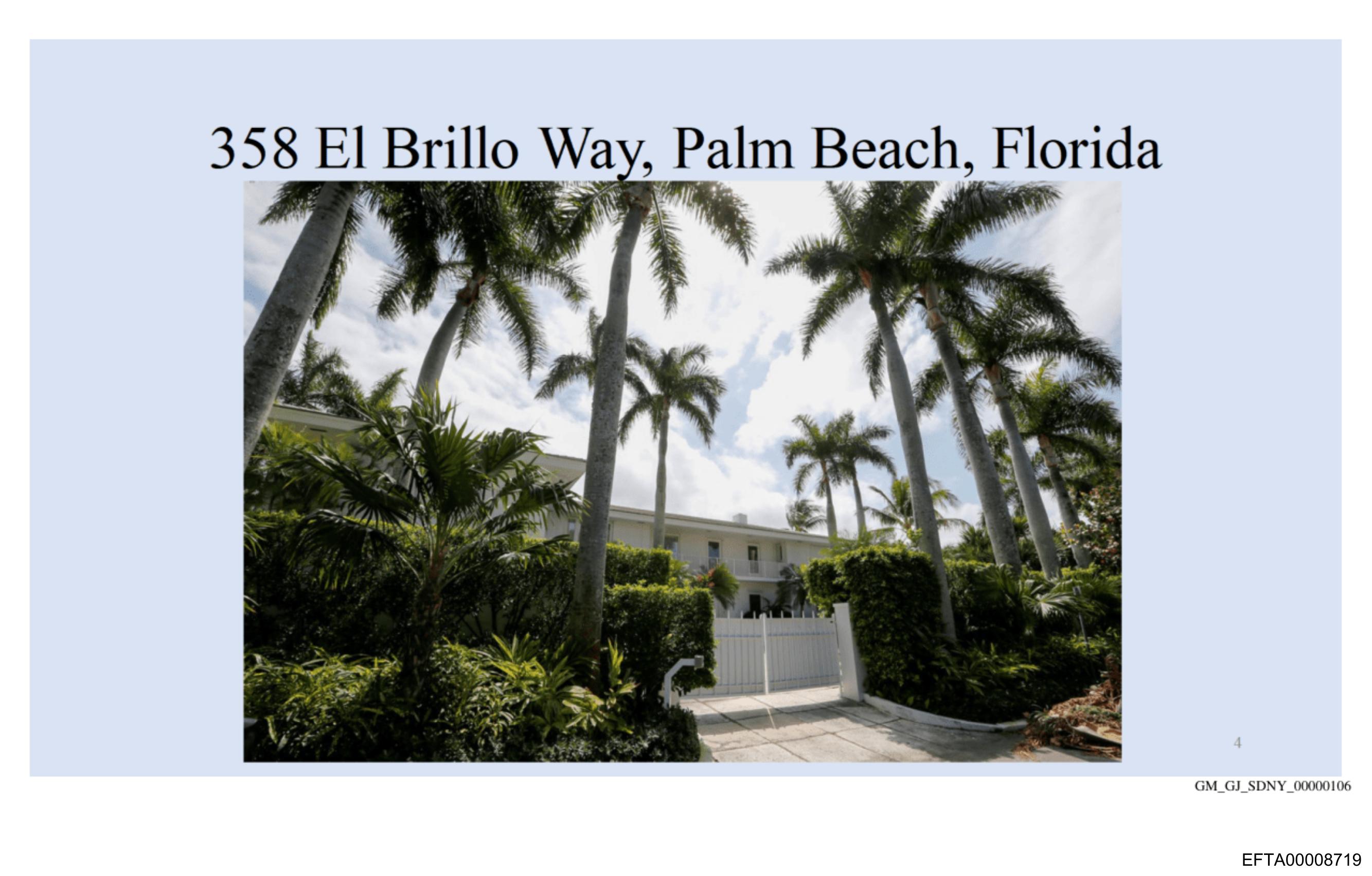 The image shows an entrance to a building with a tropical ambiance. There's a sign that reads "356 El Brillo Way, Palm Beach, Florida" indicating the location of this property. The entrance is framed by palm trees and lush greenery, suggesting a warm climate. A gate or door can be seen in front of the structure, partially obscured by foliage. The overall scene conveys a sense of serene elegance, typical of residential architecture in tropical regions like Florida.