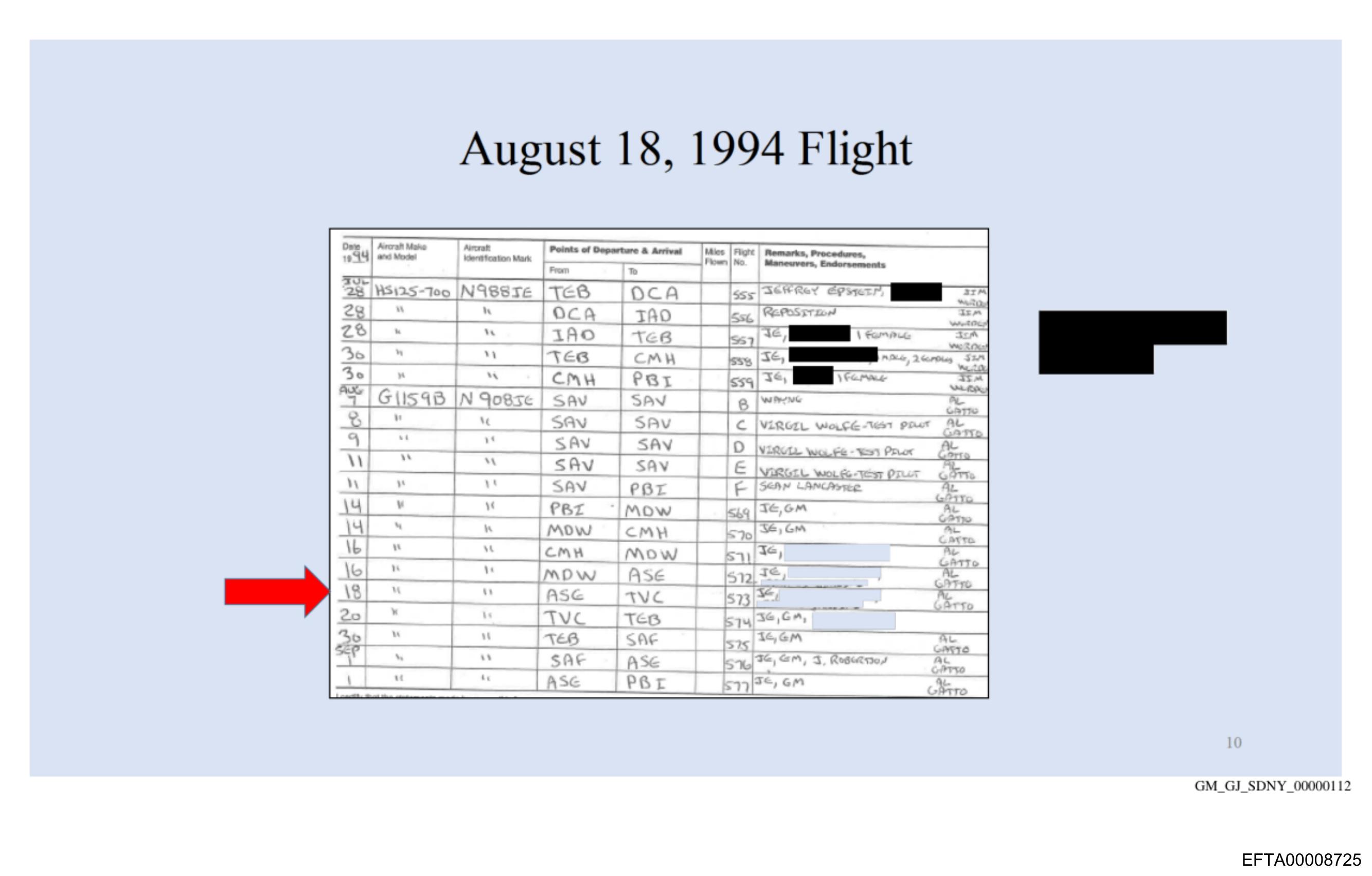 The image displays a table with various columns and rows of data, accompanied by a red arrow pointing to the second row from the top. The table is titled "August 18, 1994 Flight" suggesting that the data pertains to an event or activities on August 18th in the year 1994. The visible text includes numbers and possibly other figures or codes within the cells of the table. There are no visible people or specific locations within the image.