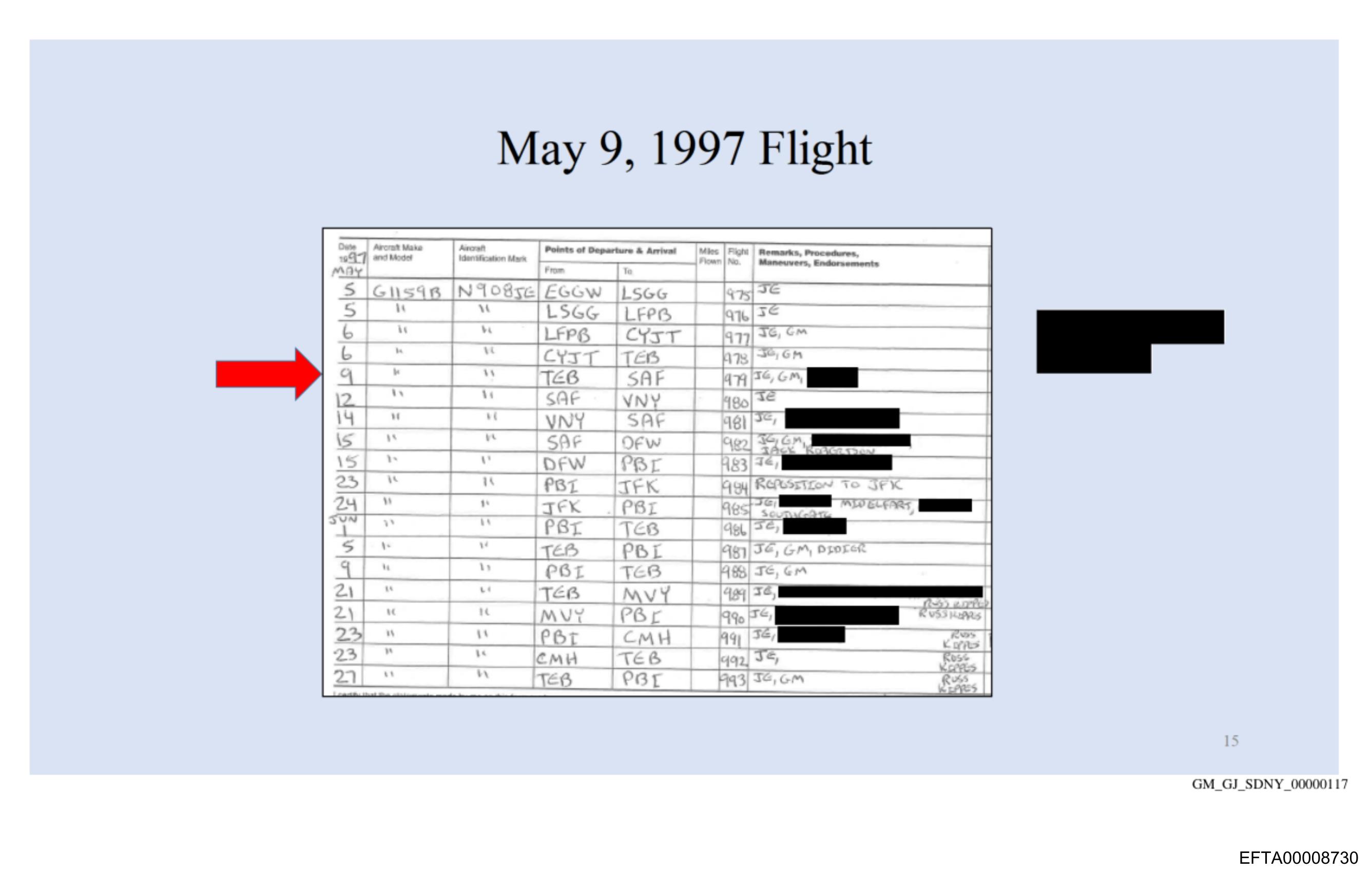 The image displays a document with a table of data and some text annotations. At the top right corner, there is a red arrow pointing to the date "May 9, 1997" which suggests that this is a significant part of the information in the document. The document appears to be related to flight details or records from that specific date, as indicated by the context provided. There are also some sections with blacked out text, possibly for privacy reasons or to comply with regulations about confidential data.