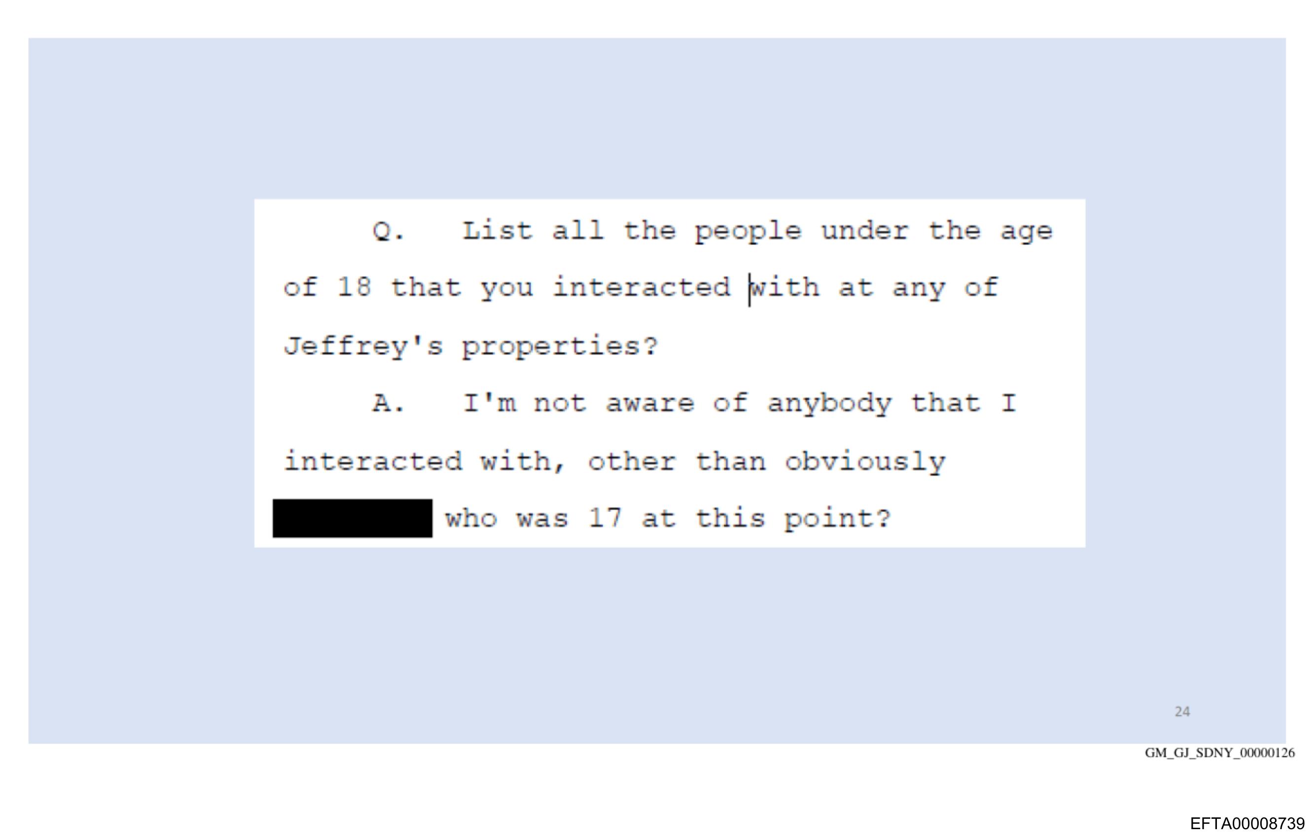 The image appears to be a screenshot of a document with a text overlay, possibly from a court case or deposition. The main text asks: "Q. List all the people under the age of 18 that you interacted with at any of Jeffrey's properties?" The response below is redacted by a black line, obscuring any names or information provided. There are no visible images of people or locations, and there are no significant objects other than the text itself.