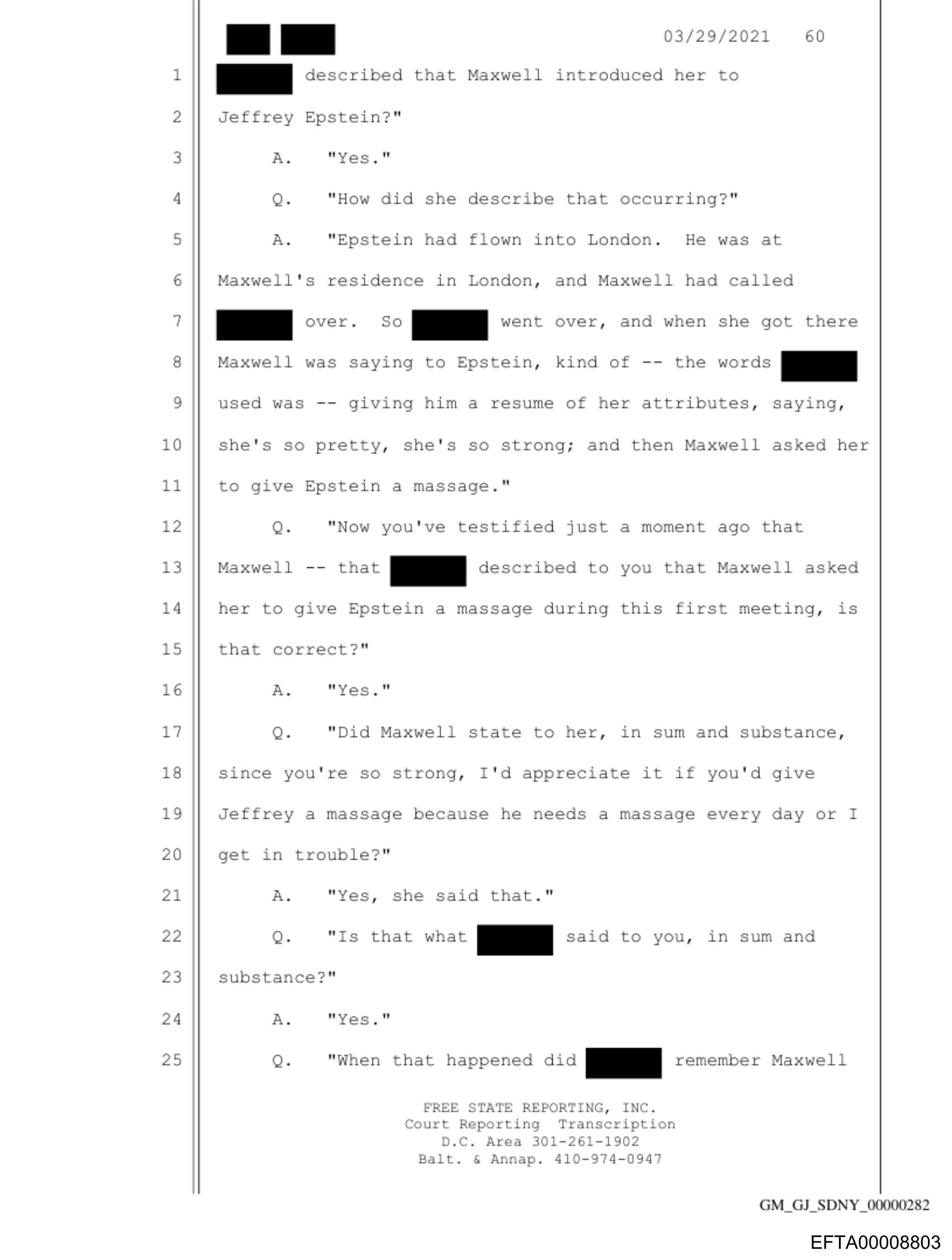 The image appears to be a photograph of a document with some form of interview or written testimony. There are lines of text that include a question and an answer, suggesting a conversation or questioning process. The specific content is not clear due to the quality of the image, but we can discern the presence of people's names and phrases such as "Yes" and "No" in relation to questions posed, indicating responses during this conversation. The text has been redacted in some areas, which is typically done to conceal sensitive information or private details.