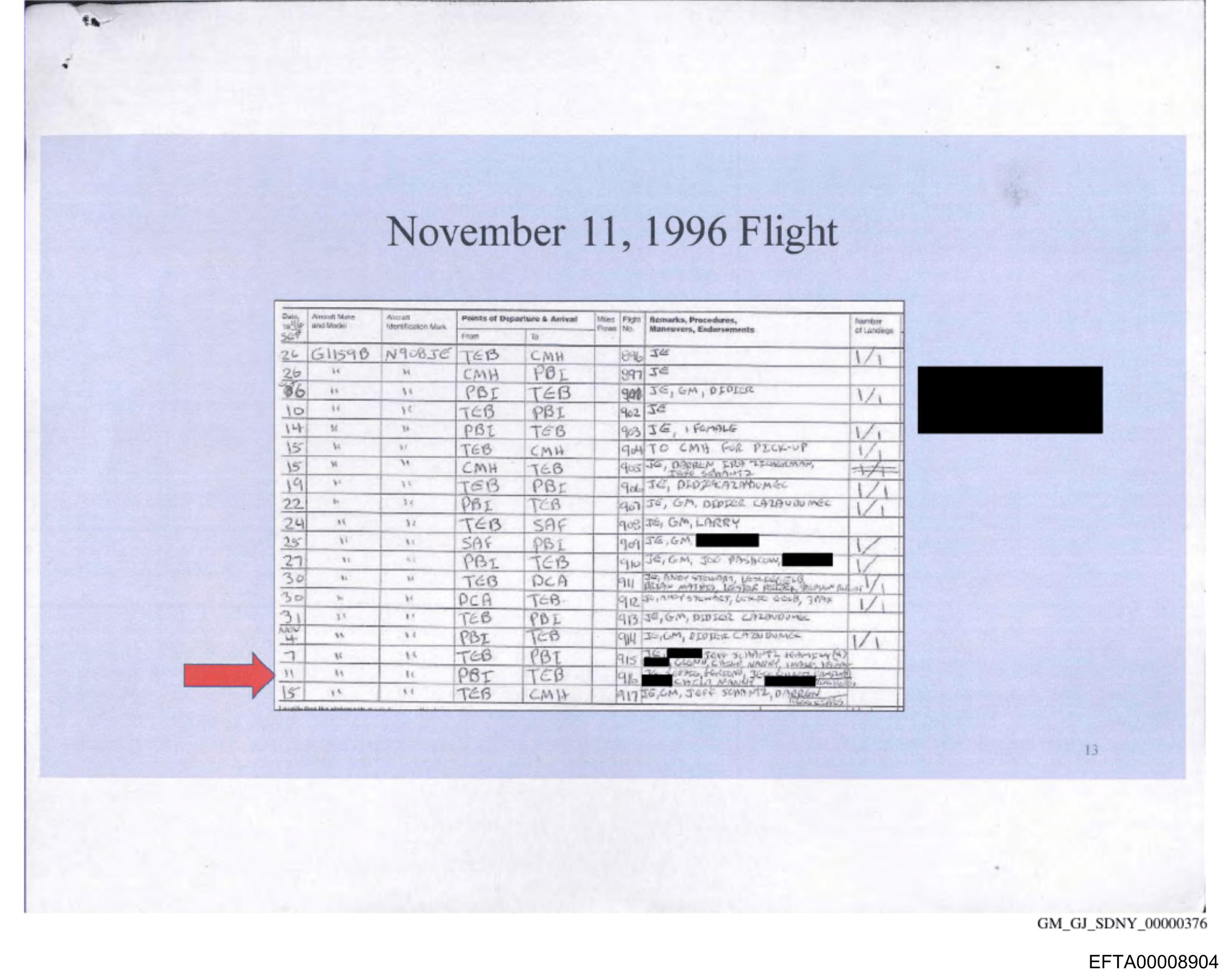The image is a photograph of a printed document with information about a flight on November 11th, 1996. The top of the page shows a header that includes the date and possibly the name "Flight" followed by another word that's not entirely visible due to the angle and distance at which the photo was taken. Below this is a table with columns of data, but most of it is obscured or redacted; only the second column from the left can be partially seen, showing numbers such as 10, 5, and others that are cut off. A red arrow points to one row in the document, highlighting something specific within the redactions; however, the details being pointed to are not clear due to the resolution of the photograph.