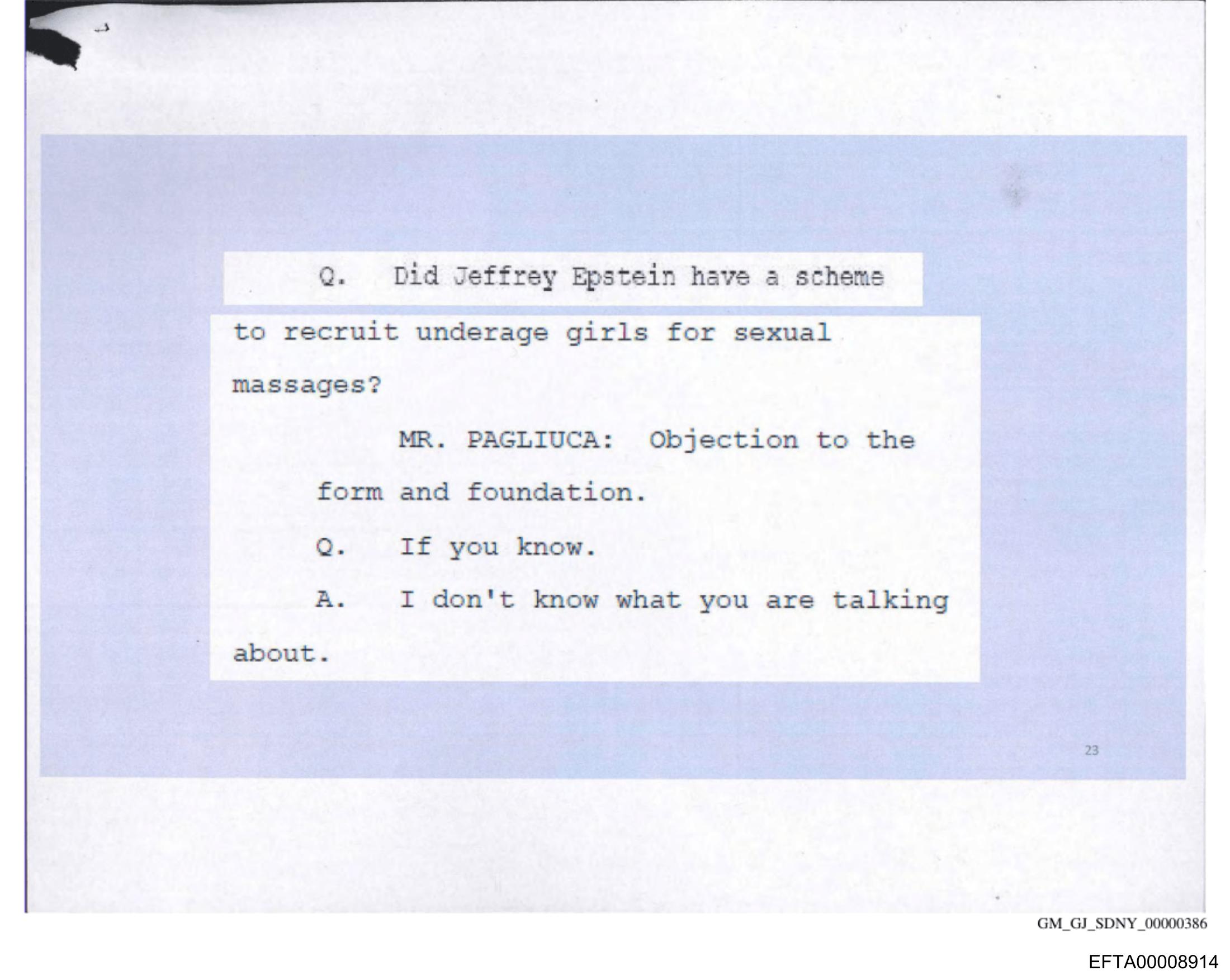 The image shows a piece of paper with printed text, which appears to be a question and answer format. The visible portion of the text includes a question that begins "Q: Did Geoffrey Ptak have a scheme to recruit underage girls for sexual purposes?" followed by an answer that is partially obscured. Only the first few words of the answer are clear: "Mr. Radiclava, I don't know what you are talking about." The style of the image looks like it may have been taken with a camera or a smartphone, capturing the printed document in an unprofessional manner. There is no visible person or location depicted on the paper itself. The text suggests that this might be related to some sort of official or legal proceeding, as indicated by the formal language and context of the question posed.