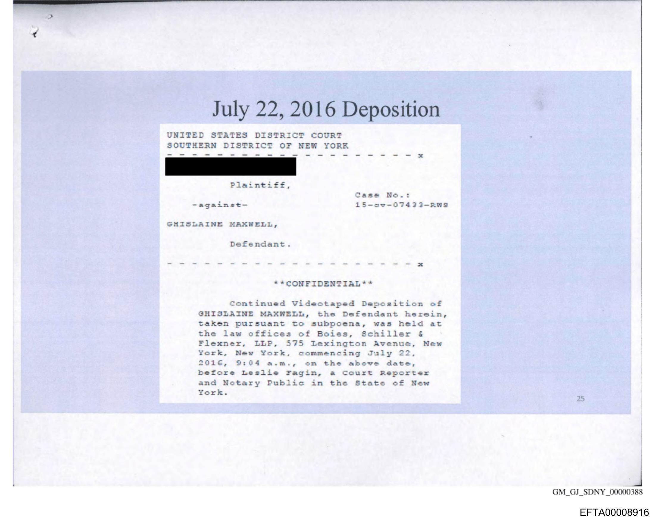 The image appears to be a photo of a document or printed material. The top part of the document contains text that reads "July 22, 2016 Deposition" suggesting this is related to a legal proceeding scheduled for July 22, 2016. There's also a redacted section that seems to contain personal information or sensitive details, as indicated by the black lines covering the content. The text is in English and is written in a standard font commonly used for formal documents. The background of the image shows some indistinct elements which do not provide clear additional context.