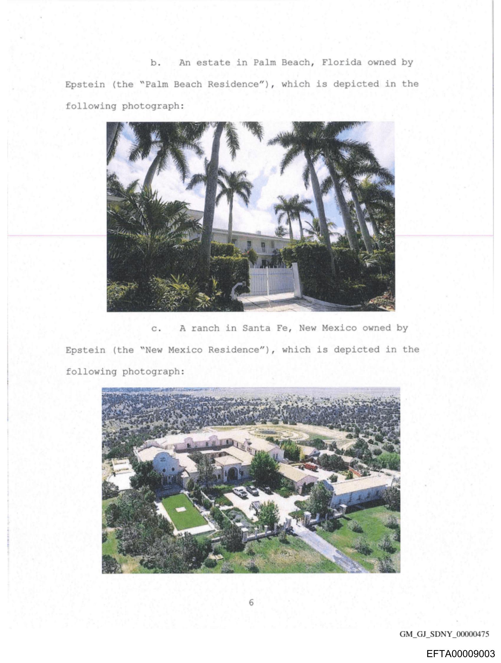 The image appears to be a scanned document with two photographs and some accompanying text. The top photograph shows an exterior view of a building with palm trees around it, suggesting a tropical location like Palm Beach, Florida. Below this, there's another photograph depicting a different building surrounded by desert-like terrain, which is described as being in Santa Fe, New Mexico. The text on the document seems to provide context for each image, mentioning "Palm Beach" and "Santa Fe" respectively, but it's not entirely clear from this description what the content of the rest of the text is about. There are no people visible in these photographs, and the focus is on the buildings themselves within their respective environments.