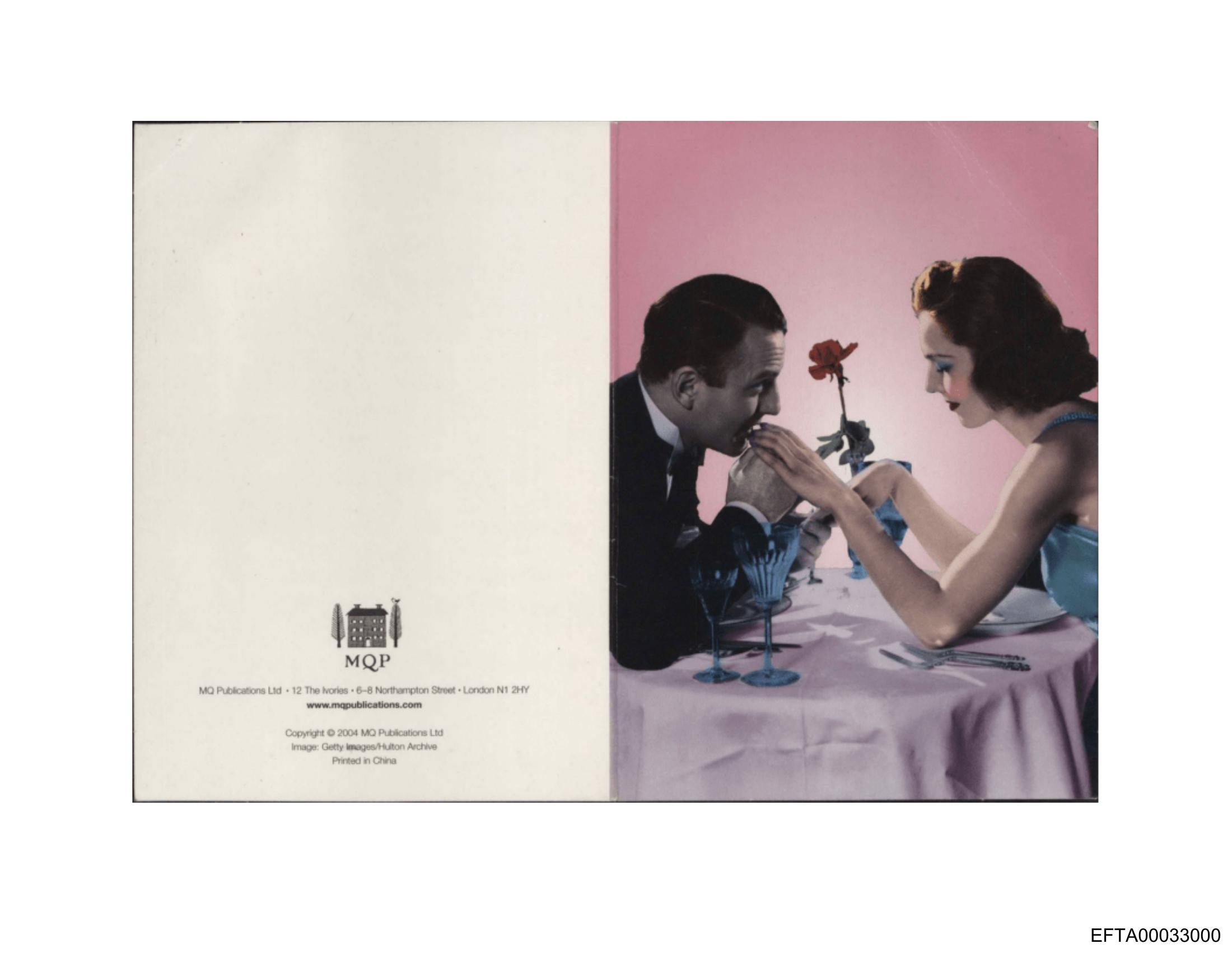 The image is a split screen photo with two distinct images placed side by side. On the left side, there's an empty white space that could represent a blank page or a section for writing or drawing. The right side features a vintage-style illustration of a couple seated at a dining table. The man and woman appear to be sharing a romantic moment, with the man holding out a flower to the woman, who is leaning over slightly towards him in what might be interpreted as an affectionate gesture. Both individuals are dressed in formal attire, suggesting a special occasion or upscale setting.