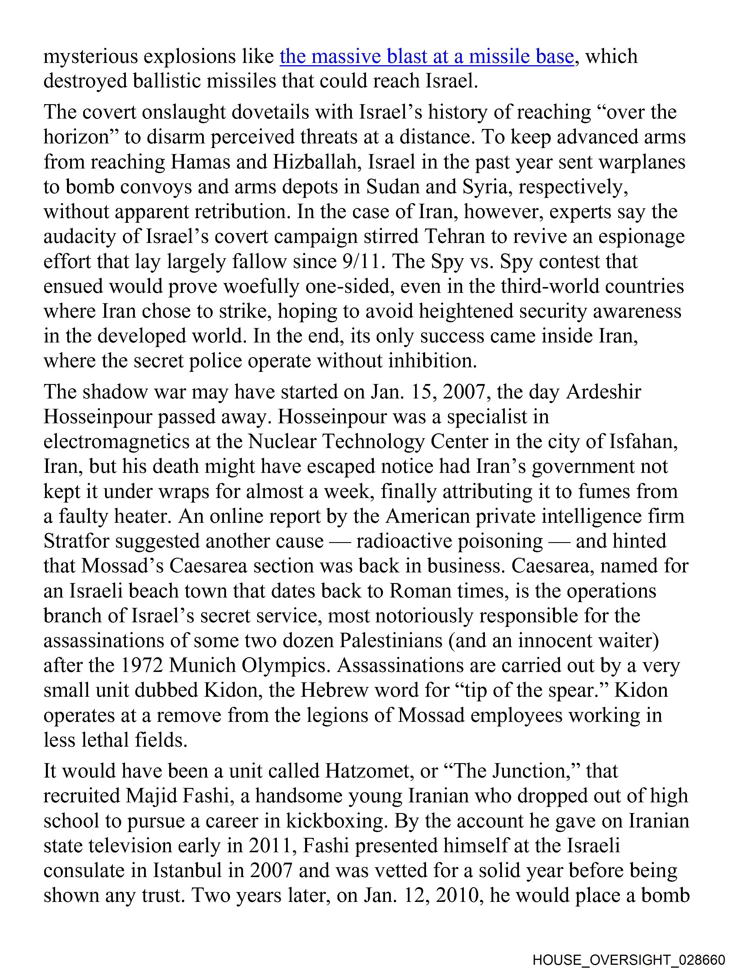 The image displays a document with printed text. The text seems to be a report or an article discussing the subject of intelligence and espionage activities within a country named Iran. It references individuals such as "Iran's Supreme Leader Ali Khamenei" and "President Mahmoud Ahmadinejad," suggesting political context related to leadership in Iran at a certain point in time. The document appears to be informational or analytical in nature, likely concerning security matters or political analyses of the country's affairs.