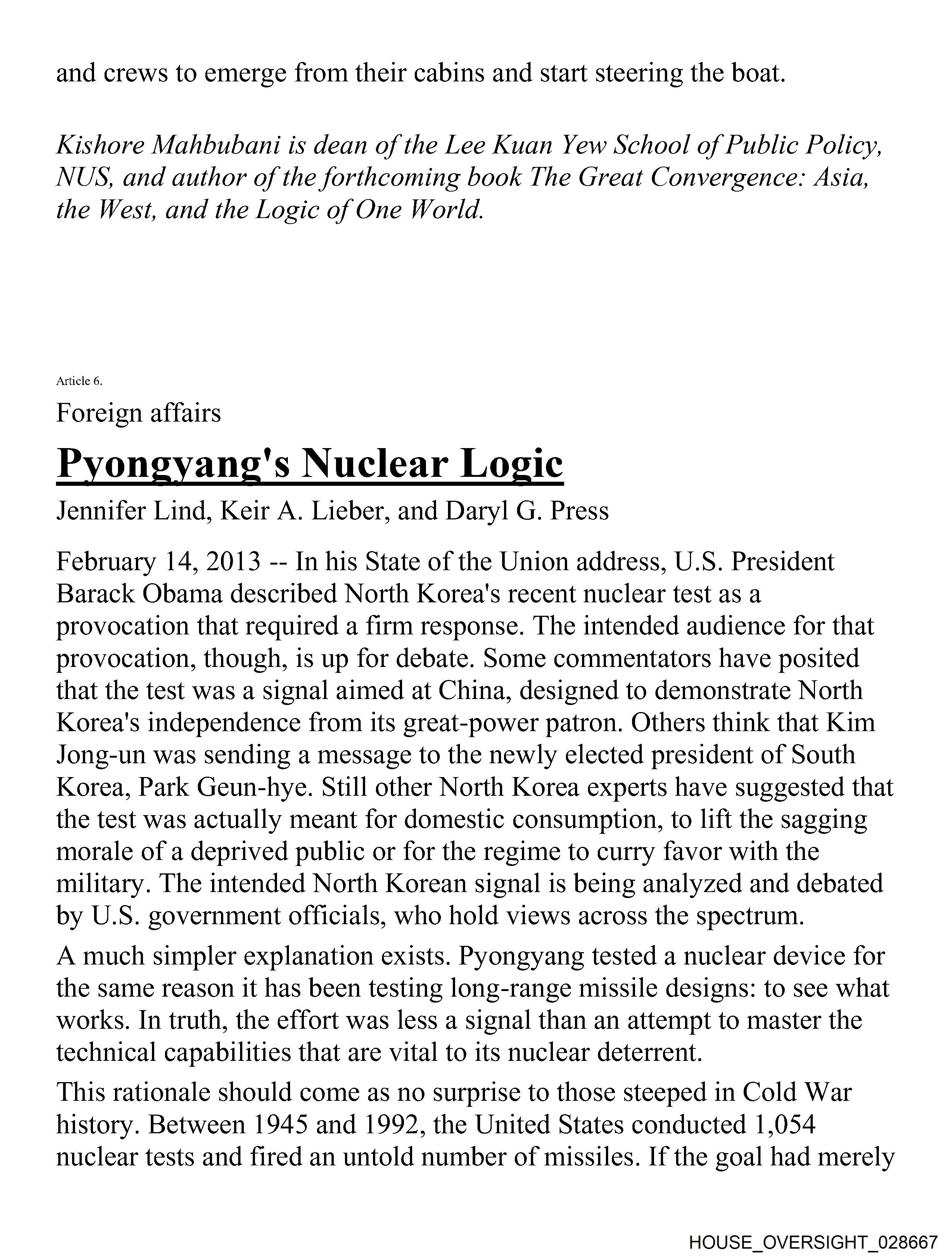 The image shows a section of printed text from a newspaper or magazine article titled "Kim Jong Un's Nuclear Logic.