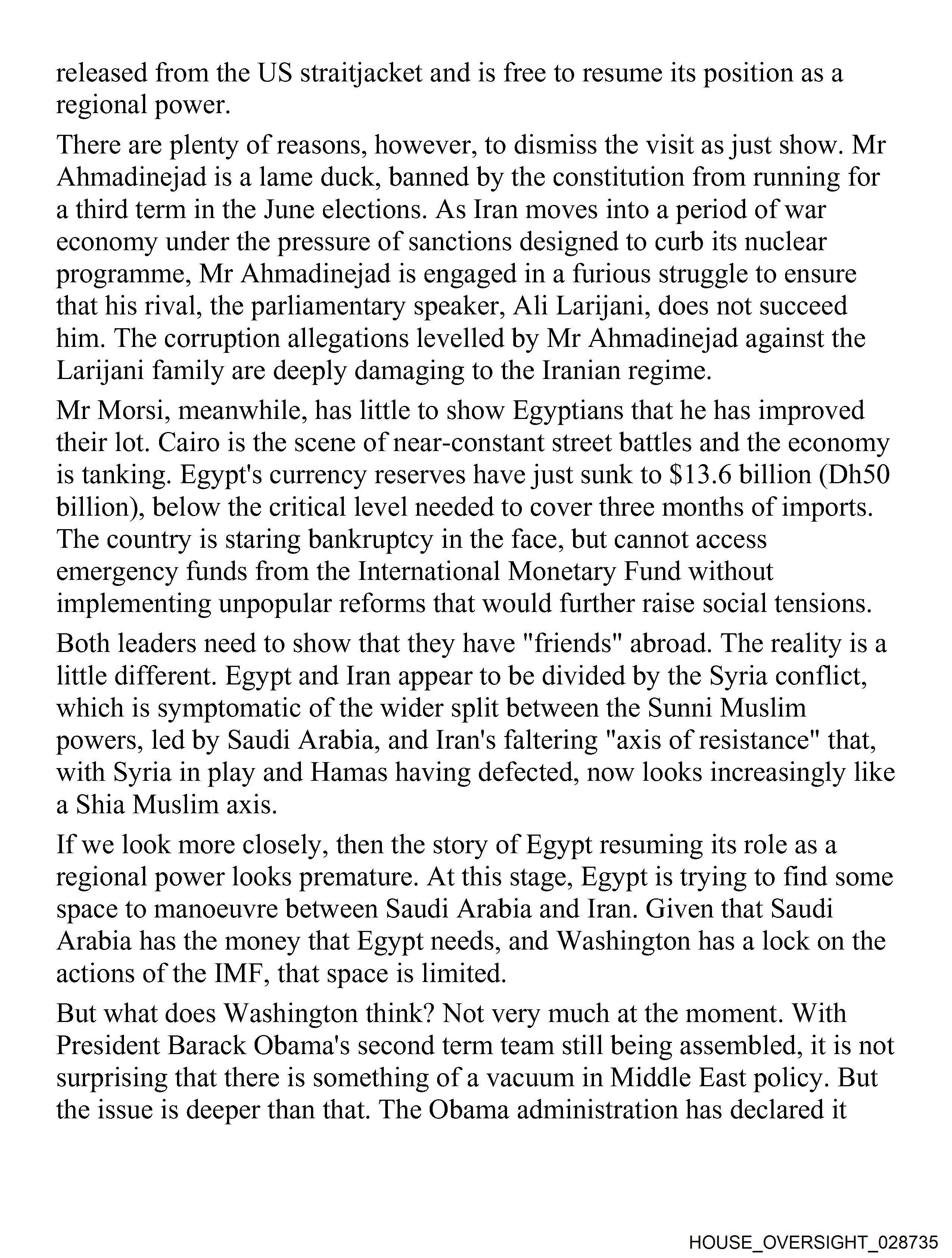 The image is a photograph of a piece of paper with text written on it. The text appears to be a combination of handwriting and printed words. It discusses various topics, including the United States, Egypt, Iran, Israel, Saudi Arabia, Iraq, and Russia. There are also references to Islamic teachings and their interpretation in different contexts. Some words like "Islamic" and "Muslims" are visible, suggesting that religious themes may be a significant part of this text. The style of the image is straightforward and documentary, capturing the content of the paper without any embellishments or artistic effects.