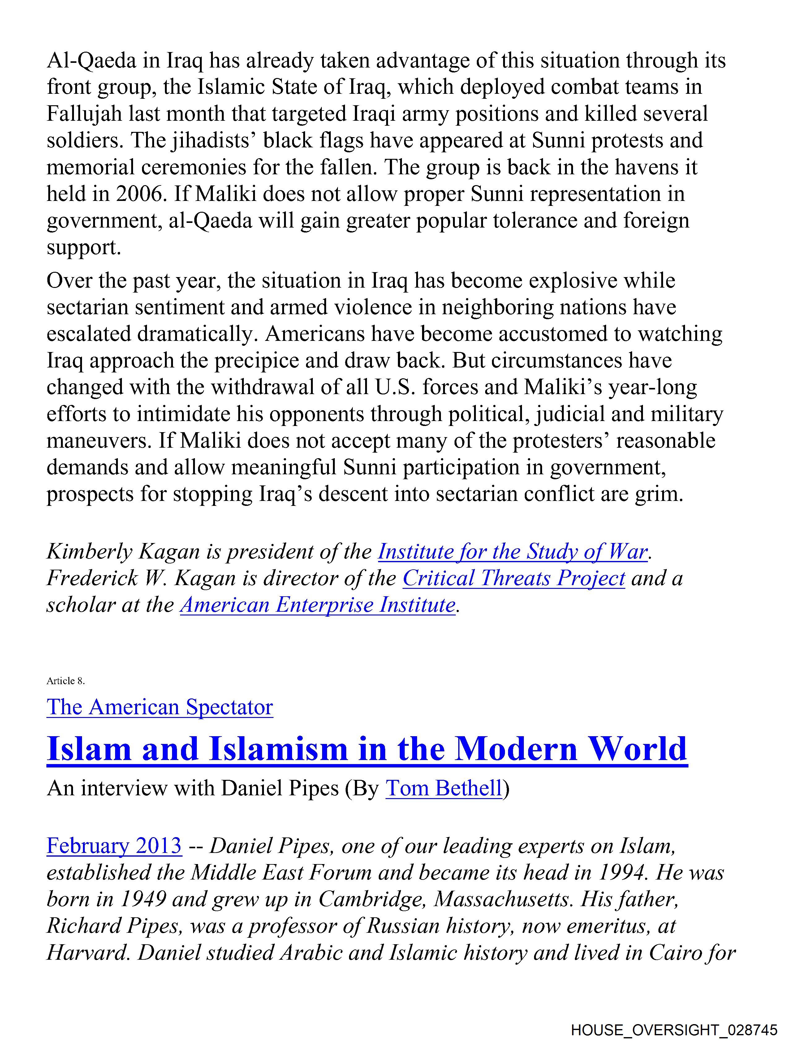 The image is a screenshot of an article from The American Interest titled "Islam and Islamism in the Modern World" by Daniel Pipes.