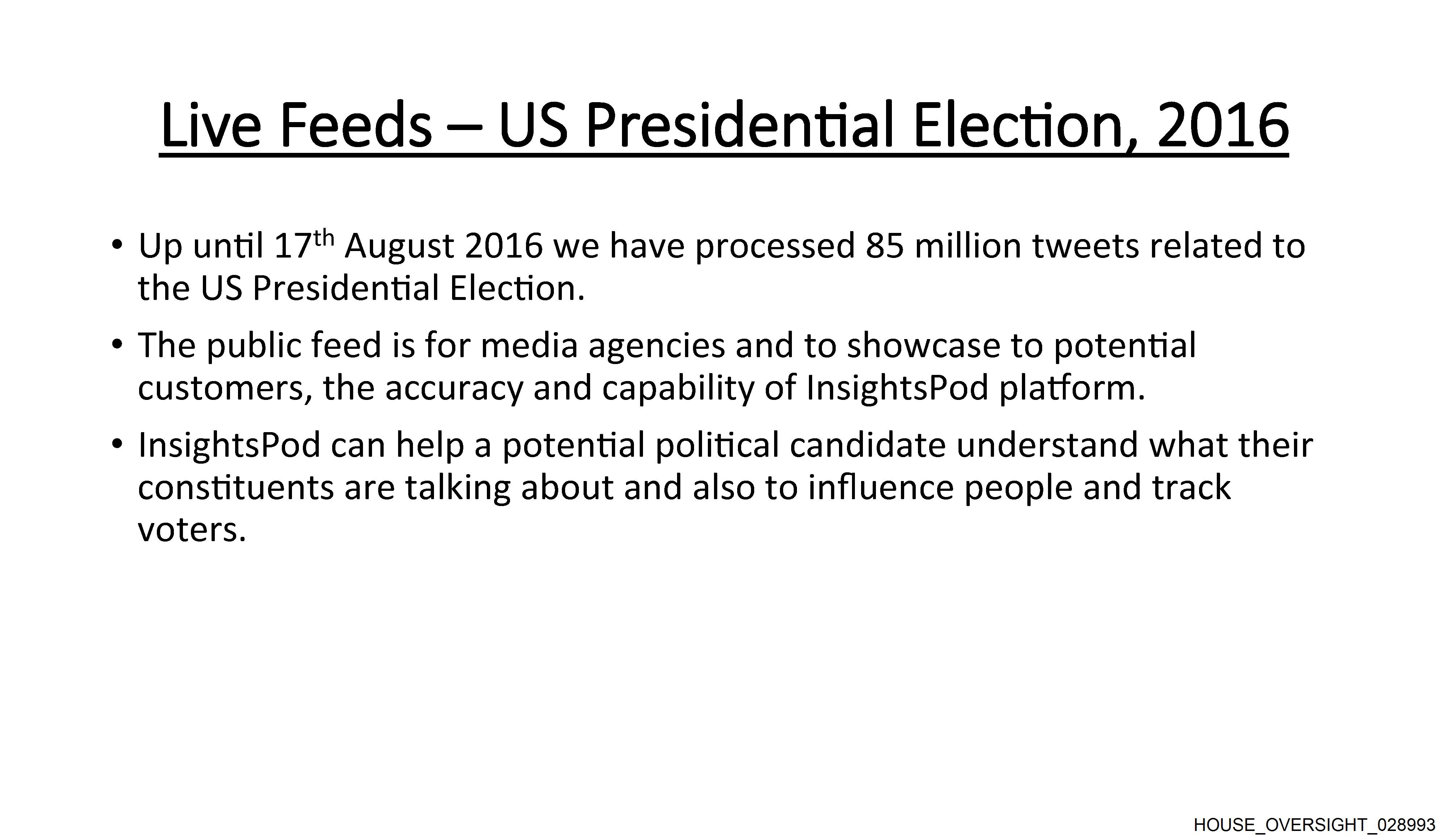 The image is a digital slide with text related to the US Presidential Election of 2016. The title at the top reads "Live Feeds - US Presidential Election 2016" in bold white letters against a black background. Below the title, there are two bullet points providing information about social media analytics and insights from the election process. However, the content of these bullet points is not entirely visible or legible due to the image's resolution and size. The style of the image is simplistic, with no additional graphics or images aside from the text.