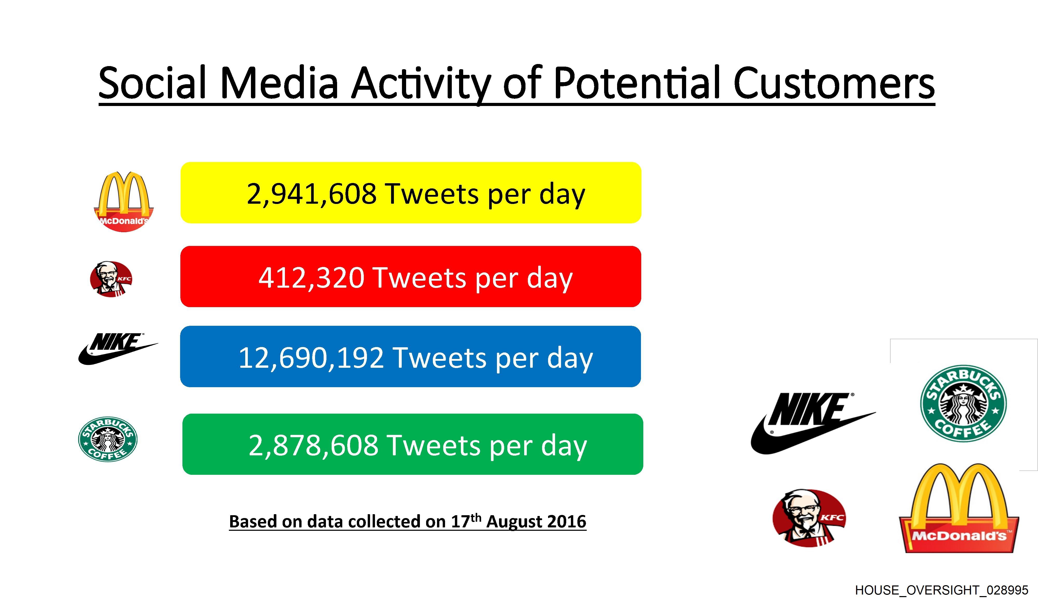 The image displays a bar chart titled "Social Media Activity of Potential Customers." The bars represent the number of tweets per day for various brands, including Starbucks, McDonald's, and Nike. The vertical axis is labeled with numbers ranging from 0 to over 3 million, indicating the scale of social media activity measured in tweets per day. The horizontal axis lists these brands: Starbucks at the top left corner, followed by McDonald's, and then Nike on the right side. The colors of the bars correspond to each brand logo beneath them: red for Starbucks, yellow for McDonald's, and green for Nike. The logos are placed below the corresponding bars, with the dates "March 2019" visible at the bottom of the image.