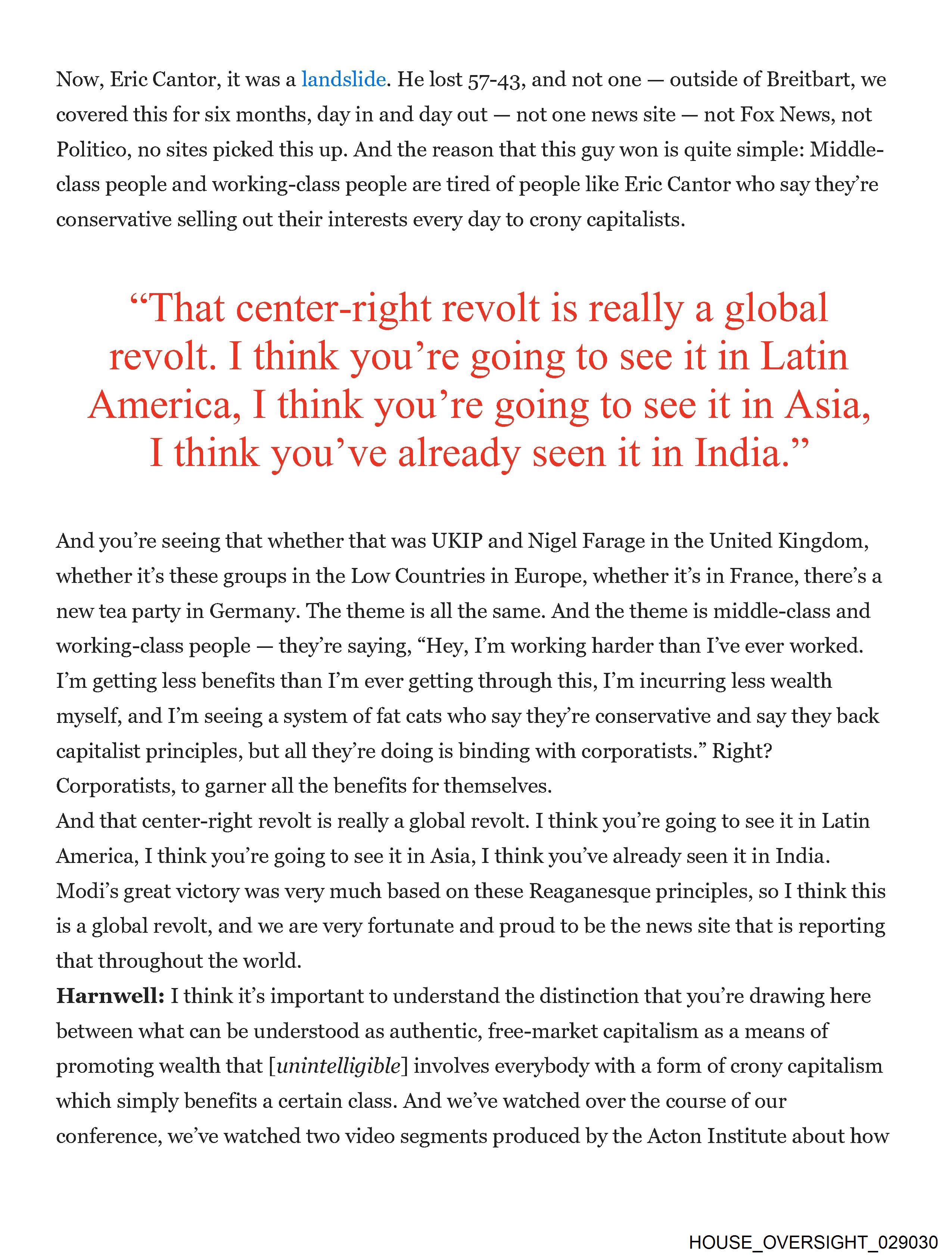 The image shows a printed document with black ink on white paper. At the top of the page, there is a heading followed by some body text, which appears to be a quote from an individual who predicts a center-right revolt in various parts of the world. The quote includes locations such as Latin America and India. Below this quote, there's more text that seems to be related to political commentary or analysis. The document has visible text throughout, suggesting it is meant for reading rather than visual display. The style of the image indicates a formal or academic setting, possibly a policy report, a news article, or an editorial piece.