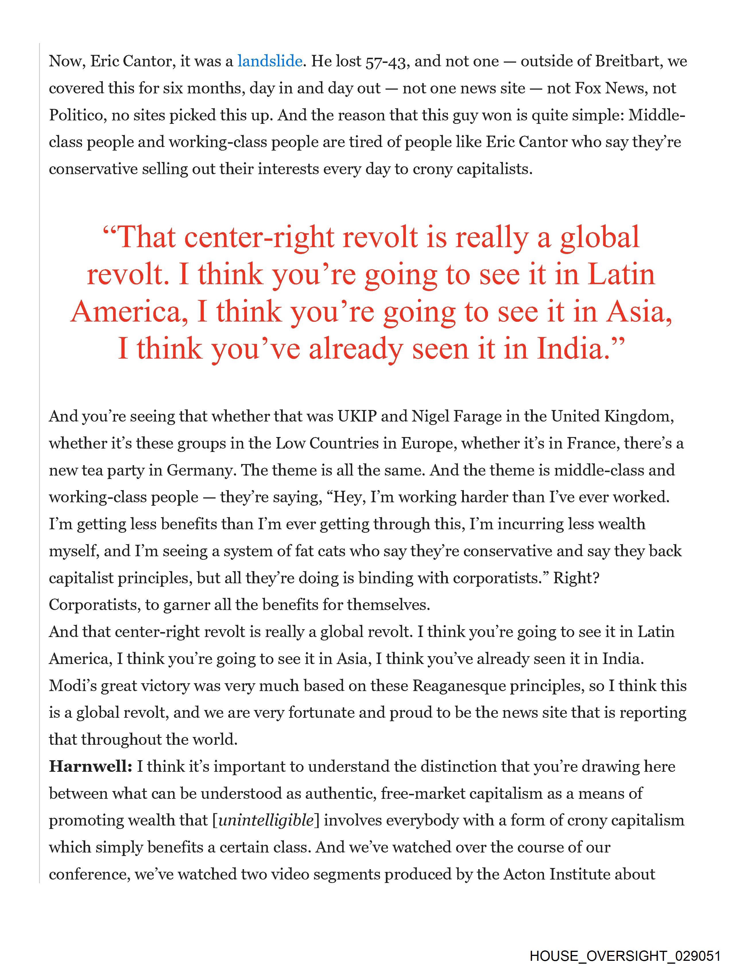 The image displays a section of a printed document with text and a red box highlighting some words. The text is too small to read clearly from this angle, but it appears to be a page from an article or publication discussing global political movements. There is no visible person or specific location within the frame. The focus is on the highlighted text, suggesting it's an important quote or statement related to center-right revolutions in various parts of the world.