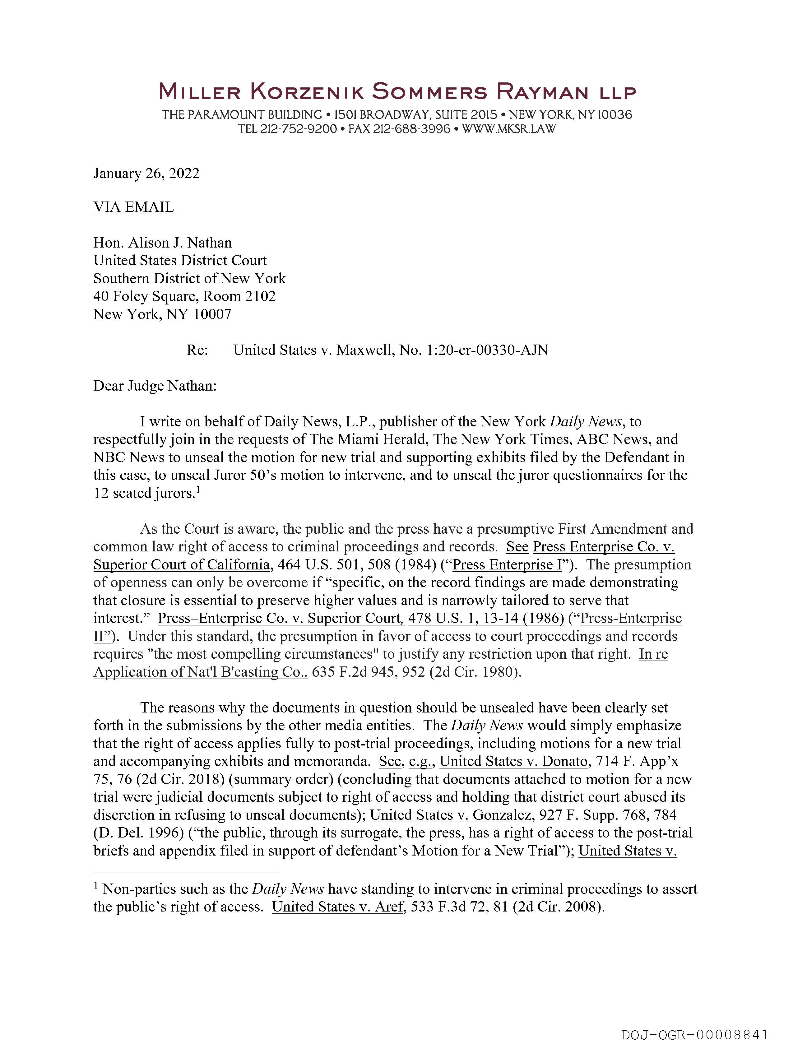 The image displays a scanned document with visible text and some blacked-out sections. The text appears to be from an official letter or report, possibly related to a legal case given the references to "Judge" and "Courtroom." There are also mentions of names that have been redacted. However, without more context, it's not possible to determine the exact nature of the document. The text is printed in black ink on a white background, indicating a standard typewritten format.