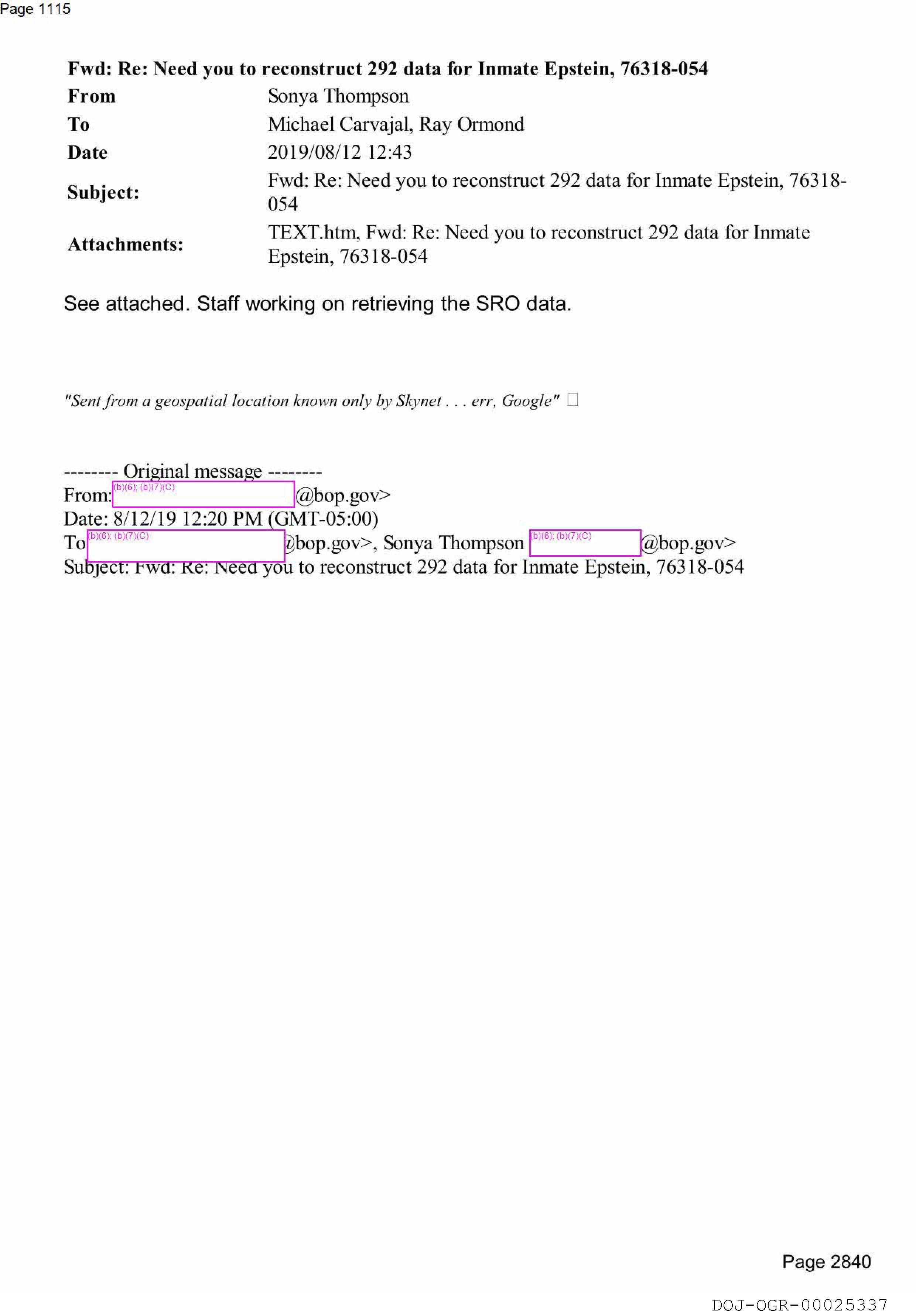 The image displays a printed document with various texts that are not entirely clear due to the resolution and focus of the photograph. The document appears to be an email, as indicated by the presence of an address "[name@email]" in the top right corner. There is also text that seems to mention some sort of data issue or update, such as "Data received for the following" followed by a line item with numbers and percentages. Additionally, there are phrases like "Please see attached" and "Will provide details tomorrow 8:30 am." The document's purpose could be related to communication about financial transactions or data records, but the specific details are not legible in this image.