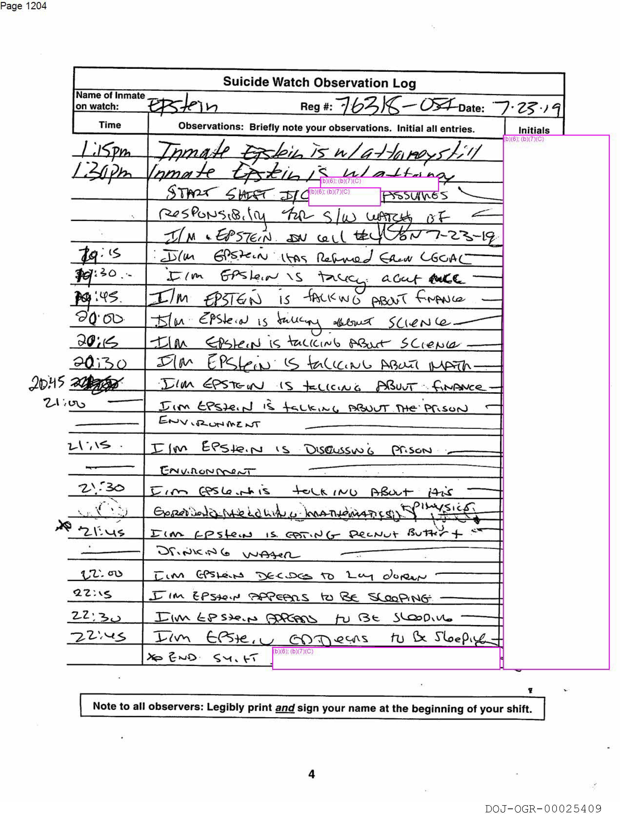 The image displays a printed document titled "Suicide Watch Observer Log" with various handwritten entries and times on it.
