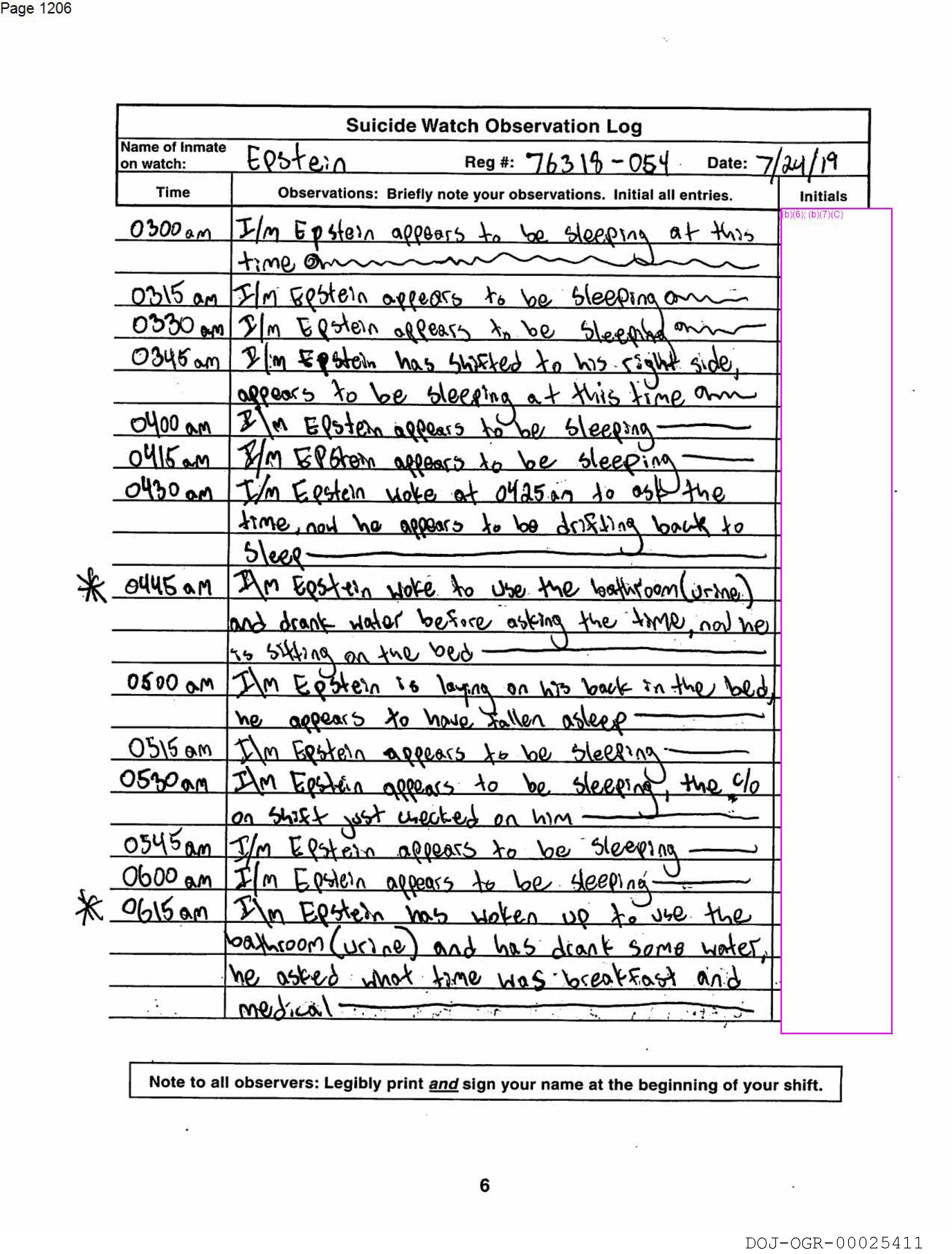 The image shows a printed document titled "Suicide Watch Observation Log" with various sections for time, date, and specific observations or actions taken by an observer.