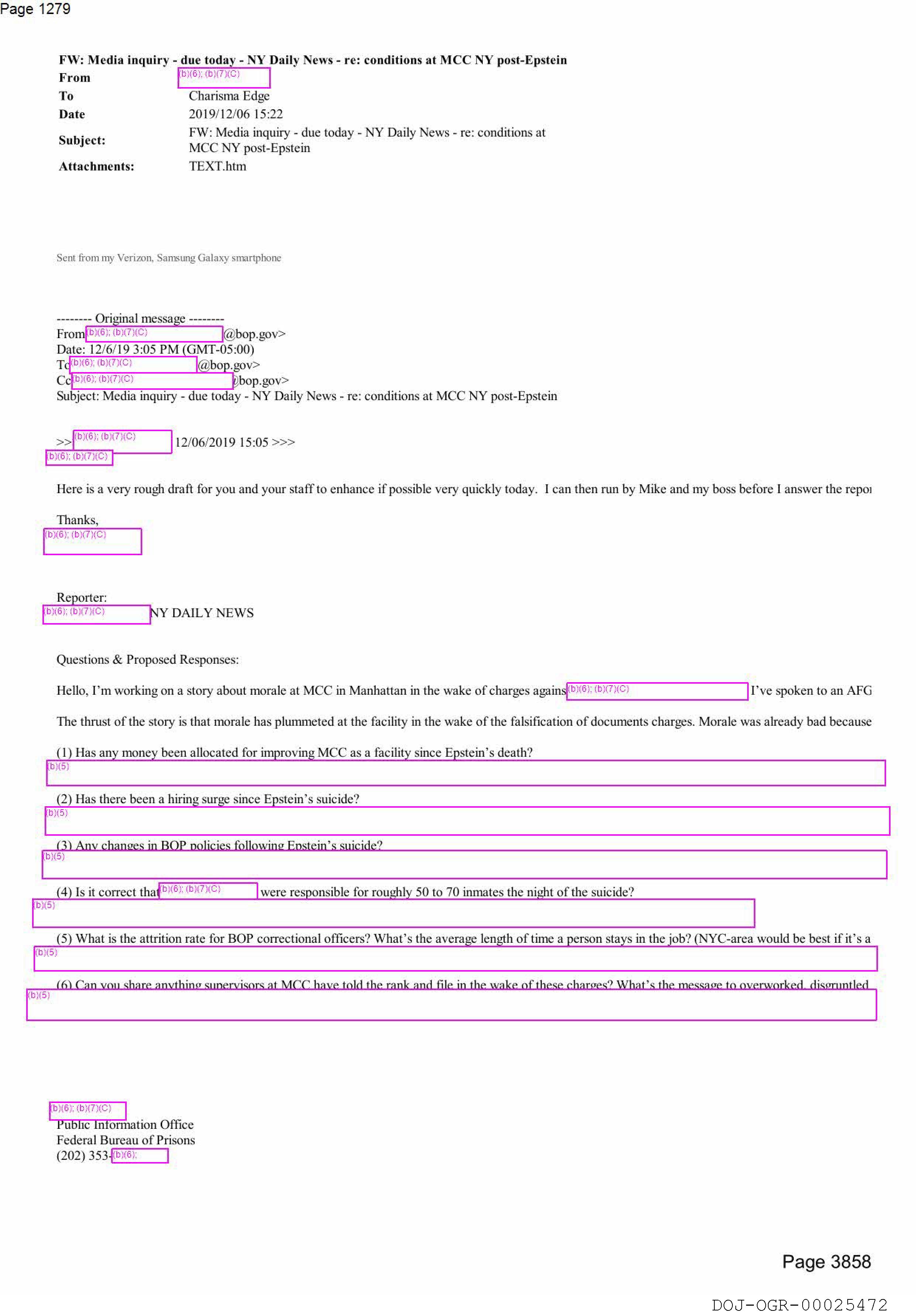 The image appears to be a digital representation of an email message with a redacted section at the bottom. The email includes some visible text, such as headers indicating the sender and recipient's names, which are not entirely clear due to the redaction. There are also portions of text that seem to discuss certain topics or issues, though their full context is obscured by the redaction marks. The image itself has a grayscale appearance with no colors other than shades of gray, and it lacks any distinct background details that might indicate location.